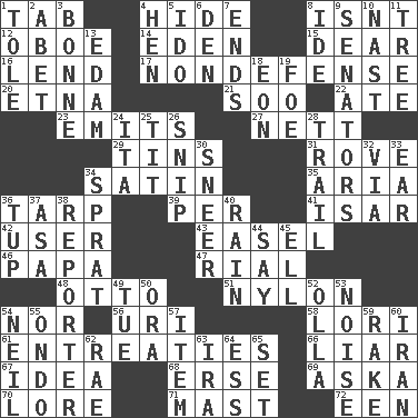 ACROSS 1. Bar bill 4. Flintstone garb 8. Is not 12. Mitch Miller's instrument 14. Genesis locale 15. Letter starter 16. Grant temporary use of 17. Unrelated to defense, as in spending 20. Inactive volcano in Sicily 21. "Barney Miller" actor Jack 22. Had dinner 23. Sends forth 27. Remaining after all deductions 29. Canisters 31. Be footloose 34. Smooth fabric 35. Operatic vocal solo 36. Canvas cover 39. For each 41. Austrian river, tributary to the Danube 42. One who makes use of a thing 43. Artist's stand 46. Dad 47. Monetary unit of Yemen 48. "Beetle Bailey" pooch 51. High-strength synthetic material 54. Or not 56. RI univ. 58. Australian parrot (variant) 61. Pleas 66. One who doesn't tell the truth 67. The main thing one is thinking about 68. Celtic language 69. "____ silly question..." 70. Old wives' tales, e.g. 71. Vertical spar for supporting sails 72. Car or cant ending DOWN 1. Lacquered or enameled metalware 2. Collude with 3. Child's nurse 4. Layer 5. Wedding promise 6. Lair 7. Conclusions 8. Binary compound 9. Elected representatives 10. Political cartoonist Thomas 11. Family _ (genealogy) 13. Dutch treat 18. A really long time 19. Enemy 24. Call ___ day 25. Teat (slang) 26. Sever or remove by pinching or nipping 28. Lag or linger behind 30. Contemptuous expression 32. By way of 33. Hearing organ 34. Small fatty European fish 36. Uncastrated adult male sheep 37. White ___ sheet 38. Newsperson 40. Precipitation 44. Declare 45. Pipe bend 49. Third day of the wk. 50. Mouth or opening 52. Rounded earthenware pot or jar 53. Annoying sound 54. Famous astronaut Armstrong 55. Southwest Nigerian state 57. A distinct part 59. Libertine 60. SW Asia republic 62. Actress Charlotte 63. Lyricist Gershwin 64. Double-curved letter 65. Arrange properly for use