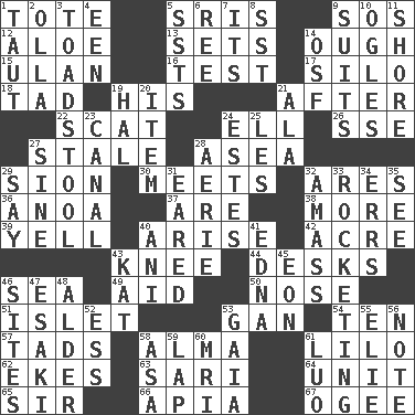 ACROSS 1. Carry 5. Indian titles of respect 9. Distress signal 12. Medicinal plant 13. Arranges properly for use 14. Ending for "Through" and "Enough" 15. ____ Bator 16. Trial 17. Grain storage tower 18. Small boy 19. Part of HMS, perhaps 21. Following 22. Get outta here! 24. Pipe bend 26. Compass dir. 27. Showing deterioration from age 28. At sea 29. The Jewish people; Israel 30. Confronts 32. Ancient Greek god of war 36. Small Philippine buffalo 37. "We ___ not amused" (Victoria) 38. Greater amount 39. Shout 40. Get up 42. Land measure 43. Leg joint 44. Writing tables 46. Ocean 49. Help 50. Characteristic smell of wine 51. Small island 53. Separate the seeds from cotton 54. "___ Little Indians" 57. Bits 58. _ mater 61. _ and Stitch 62. Makes supply last 63. Indian skirt 64. A single undivided whole 65. Title for a knight 66. Capital of Western Samoa 67. Double curve, resembling the letter S DOWN 1. Tense 2. Rounded earthenware pot or jar 3. Inedible or poisonous agaric 4. Car or cant ending 5. Fast planes 6. Portuguese money of account (variant) 7. It is 8. Fast jet (abbr.) 9. Costumes for special activities 10. Stares at amorously 11. Dinah or Pauly 14. Order of Saint Francis (abbr.) 19. Actor Linden 20. A distinct part 21. According to 23. Lessep's creation 24. _____ Park, CO 25. French article 27. Trig term 28. Nest on high 29. Declare 31. Having ears or earlike features 32. Collect or gather 33. Shooting up abruptly 34. Blunders 35. Observe 40. Cuckoo 41. Pulitzer Prize-winning author Ferber 43. Krazy ___ of comics 45. Age 46. Settings 47. 1973 Nobel Price Winner (Physics) Leo 48. Tree or shrub in the Birch family 52. Curvy letter 53. Greek goddess of the earth (variant) 55. Writer Wiesel 56. Musical sound 58. White ___ sheet 59. Infant locale 60. Medical imaging device (abbr.) 61. Nilotic language