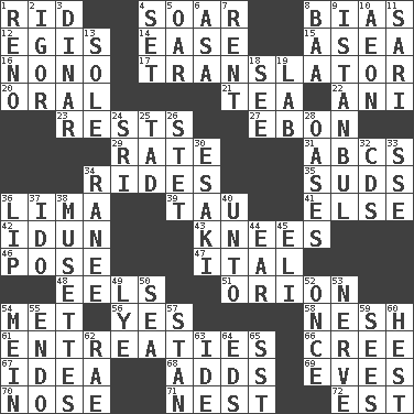 ACROSS 1. To free from 4. Fly high 8. Prejudice 12. The front part of a cuirass 14. Comfort 15. At sea 16. Words to Nanette 17. Interpreter 20. Of the mouth 21. Afternoon social gathering 22. Cuckoo 23. Musical pauses 27. Inky black, to poets 29. Assign a rank or rating to 31. Lettered men learn these first 34. Amusement-park features 35. Soap bubbles 36. Pale green bean 39. The 19th letter of the Greek alphabet 41. Otherwise 42. Goddess of spring and wife of Bragi 43. Leg joints 46. Introduce or present, as a question 47. Slanted text style (abbr.) 48. Snakelike fish 51. Constellation of myth 54. Was introduced to 56. Consenting reply 58. Soft 61. Pleas 66. Algonquian 67. It may be bright or harebrained 68. Sums up 69. Nights before holidays 70. Olfactory organ 71. A home for chicks 72. Eastern Standard Time (abbr.) DOWN 1. Western Nevada city 2. Russian composer Stravinsky 3. Middle Eastern gold or silver currency 4. Arrange properly for use 5. Boat paddle 6. White ___ sheet 7. Monthly bill 8. Sound made by sheep 9. Byzantium, centuries later 10. A really long time 11. Indian skirt 13. Flatfish 18. Observe 19. Experiment locale 24. Indian title of respect (Mr.) 25. Small amount or degree 26. Proofreading order 28. Fertile tracts in a desert 30. 1973 Nobel Price Winner (Physics) Leo 32. Music discs 33. Compass dir. 34. Indian princess (variant) 36. Mouth edge 37. Wedding promise 38. French bagpipes 40. To (old English) 44. Ewer handle 45. Connecticut Ivy Leaguer 49. Potassium hydroxide 50. Ocean 52. Single time 53. Impudent aggressiveness 54. Count _ (2 wds.) 55. Inside; within (prefix) 57. Comedian Laurel of Laurel & Hardy 59. Perceives with the eye 60. Behest 62. Actress Charlotte 63. Binary compound 64. Begley and Asner 65. Fast jet (abbr.)