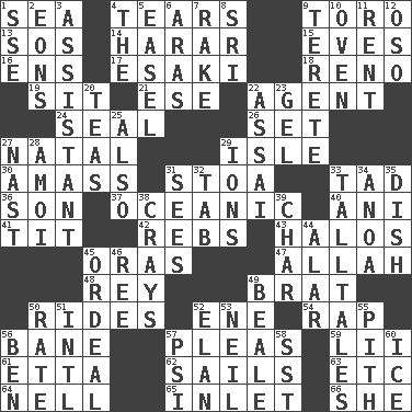 ACROSS 1. Ocean 4. Separates forcefully 9. "Corrida" creature 13. Mayday 14. Ethiopian city, capital of Harari 15. Nights before holidays 16. Followers of ems 17. 1973 Nobel Price Winner (Physics) Leo 18. Former U.S. Attorney General Janet 19. Be seated 21. Compass dir. 22. Representative 24. Lick closed 26. Arrange properly for use 27. Brizilian seaport 29. Small island 30. Collect or gather 31. Portico 33. Small amount or degree 36. Male child 37. Pertaining to the sea 40. Black tropical American cuckoo 41. Teat (slang) 42. Confederate soldiers (slang) 43. Rings 45. Mouths or openings 47. Assad's deity 48. Marina Del _, California 49. Naughty child 50. Amusement-park features 52. Compass dir. 54. Strike 56. Object of repulsion 57. Entreaties 59. Cards in a Roman deck? 61. Singer James 62. Moves on water 63. And so on (abbr.) 64. 1994 drama film starring Jodie Foster 65. An arm off of a larger body of water 66. A female animal or person DOWN 1. Compass dir. 2. Immeasurably long periods of time 3. Aide 4. Definite Article 5. Artist's stand 6. Ancient river in northeast Turkey 7. Immoral or dissolute person 8. Indian title of respect (Mr.) 9. Cigar-shaped 10. Baking chamber 11. Monthly bill 12. Bear (Spanish) 20. Afternoon social gatherings 22. Slender Brazilian palm 23. Set 25. In addition 27. Political cartoonist Thomas 28. Mine, in Marseilles 29. Charged atoms 31. Perceives with the eye 32. Bar bill 33. Baron Munchausen's specialties 34. Small Philippine buffalo 35. Food container 38. Trading vessels 39. Burn to charcoal 44. Having or resembling wings 45. Severe or trying experience 46. To separate or throw off 49. Memphis, Tenn. Street 50. Pace 51. International (abbr.) 52. Flair 53. Famous astronaut Armstrong 55. Essential or central part 56. Benjamin's nick name 57. 23rd letter of the Greek alphabet 58. Fast jet (abbr.) 60. Frozen water