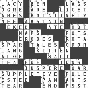ACROSS 1. Made of lace 5. Benjamin's nick name 8. Straggles 12. Legendary monster 13. "We ___ not amused" (Victoria) 14. It is permitted: Lat. 15. Ancient Greek god of war 16. Happening in regular succession 19. Born 20. Refrain by choice 21. Supplemented with great effort 23. Had dinner 24. Being at a high temperature 27. Atlas contents 30. Plant holders 31. Eats (away) 34. Round or rotation of duties 35. Coast Guard woman 38. Falsehoods 40. Scent 41. Long (Scottish) 42. Baby cat 44. Medicinal plant 45. Table seasoning 46. Afternoon social gathering 47. Enemy 50. Charged atoms 53. Stimulate to action 57. Boat paddle 59. Supplying deficiencies 63. Whimper 64. First name in cosmetics 65. Baking dish 66. Pismires 67. Pull into pieces 68. Conclude 69. Inconspicuous attention getter DOWN 1. Grant temporary use of 2. Match 3. Small stream 4. Affirmative reply 5. Sharp remark 6. Greek god of love 7. Remaining after all deductions 8. 54 in ancient Rome 9. Adept person 10. Set 11. Filthy place 14. Actor's bit 17. Auto club (abbr.) 18. Teat (slang) 20. The sixth month of the Jewish calendar 22. Develop 24. Parka part 25. Von Bismarck 26. Russian ruler of old 28. Plant holder 29. Neighbor of Neb. 30. Right away 32. Biblical high priest 33. Arranges properly for use 35. Narrow board 36. Diluted with white 37. Small Philippine buffalo 39. R.R. building 43. Writer Wiesel 47. Do some clerical work 48. Single 49. Eastern Standard Time (abbr.) 51. Parts of speech 52. Table seasonings 54. Corncob 55. _ the terrible 56. Tear apart 58. Relief 59. Put into a specified state 60. Purpose 61. Parent Teacher Association (abbr.) 62. For each 63. Infant food