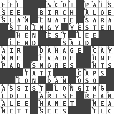 ACROSS 1. Snakelike fish 4. Native of Scotland 8. Friends 12. Perceive with the eye 13. A tree used for making furniture 14. _ vera 15. Cole _ (cabbage dish) 17. Maternal 18. "Two Mules for Sister ____" 19. Slender, wiry 21. Last 23. Layer 24. Eastern Standard Time (abbr.) 26. Area sheltered from the wind 27. Grant temporary use of 28. Alleged 30. Atmosphere 31. Break 34. Island 37. Madame (abbr.) 38. Elude 39. Single 40. Writing tablet 41. Sounds asleep 42. Mountains (abbr.) 43. Jacques of French films 44. Smile enhancers 46. Electrically charged atom 47. Daniel's nick name 50. Bear (Spanish) 51. Aid 54. Yearning 57. Hang loosely or laxly 58. Ascend 60. 480, 500 or 516 sheets of paper 62. Toward shelter 63. French painter Edouard 64. Teachers' org. 65. Remaining after all deductions 66. Perceives with the eye 67. Affectionate concern, for short DOWN 1. Double-curved letter 2. Snakelike fish 3. Resembling or made to resemble leather 4. Scorch 5. Trading vessels 6. Sep. follower 7. Those things 8. Went by 9. Having winglike extensions 10. Old wives' tales, e.g. 11. Burn superficially 13. Benjamin's nick name 16. Songbird 20. Working for oneself (abbr.) 22. Writer Wiesel 25. Sadhe (variant) 27. Pale green bean 29. Grows older 30. Electrical Unit 31. Gouge 32. Keep away from 33. Spoil 34. Part 35. Pismires 36. Affirmative reply 41. Without 43. Rest room 44. Gear tooth 45. SW Saudi Arabia district 46. Small island 48. Place in a line 49. Olfactory organs 51. ____ Jay Lerner 52. Flatfish 53. Scottish caps 55. Fish or hair follower 56. Highlander 59. Actress Charlotte 61. Apple computer (short form)