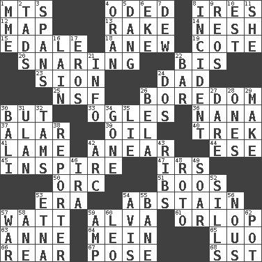ACROSS 1. Mountains (abbr.) 4. Wrote a lyric poem 8. Angers 12. Atlas unit 13. Immoral or dissolute person 14. Soft 15. Peak District village in England 18. Afresh 19. ____ d'Azur (French Riviera) 20. Catching in a trap 22. Altar cloth linen 23. The Jewish people; Israel 24. Male parent 25. Science/research agcy. 26. Mood resulting from idleness 30. Yet 33. Stares 36. Grandmother 37. Having or resembling wings 39. Petroleum 40. Long journey 41. Unable to walk 42. Approach 44. Compass dir. 45. Stimulate to action 47. Big collection agency 50. The grampus (Milton) 51. Scornful sounds 53. Epoch 54. Choose not to consume 57. Electrical Unit 59. Inventor's middle name 61. Lowest deck of a ship 63. Singer Murray 64. Chow _ 65. Nilotic language 66. Rump 67. Introduce or present, as a question 68. Fast jet (abbr.) DOWN 1. Madame (abbr.) 2. Small amounts or degrees 3. Connects, as a bridge 4. Northwest Algerian city 5. Mild oath, euphamism for damn 6. Supplement with great effort 7. Morning condensation 8. Event 9. Vintage cars 10. Eastern Standard Time (abbr.) 11. A female animal or person 16. (Had) reclined 17. Greek god of love 21. Information 22. Drinking establishment 24. Two (Sp.) 26. Actor Lugosi 27. Have the gumption 28. Singles 29. Cause to be 30. Indonesian resort city 31. ____ Bator, Mongolia 32. Scottish caps 34. Went 35. Whopper 38. Newsperson 42. Curve 43. Chest bones 46. Retirement account (abbr.) 48. Printing process, for short 49. Fly high 52. Beverly of Met fame 53. Inactive volcano in Sicily 54. Advice 55. Object of repulsion 56. Horse sense 57. Armed conflict 58. A saturated hydrocarbon 59. Electrical Unit 60. Lion 62. Plant holder
