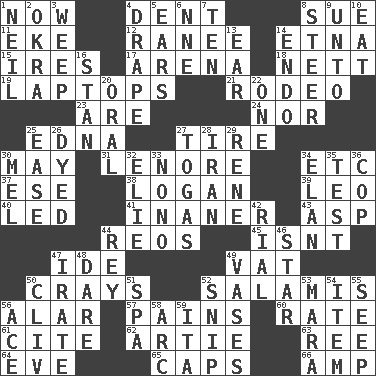 ACROSS 1. Immediately 4. Scratch 8. Take to court 11. Supplement with great effort 12. Indian princess (variant) 14. Inactive volcano in Sicily 15. Angers 17. Sports stadium 18. Remaining after all deductions 19. Portable computers 21. Cowboy competition 23. "We ___ not amused" (Victoria) 24. Or not 25. Pulitzer Prize-winning author Ferber 27. Become fatigued 30. Fifth month 31. Poe poem 34. And so on (abbr.) 37. Compass dir. 38. Utah city north of Ogden 39. Lion 40. Directed 41. Sillier 43. Cleo's killer 44. Vintage cars 45. Is not 47. Binary compound 49. Large container 50. Trading vessels 52. Deli grouping 56. Having or resembling wings 57. Aches 60. Pace 61. Quote 62. Nick name for Arthur 63. To riddle 64. Night before a holiday 65. Balmoral and tarboosh 66. Electrical Unit DOWN 1. Famous astronaut Armstrong 2. Gumbo ingredient 3. Shed a tear 4. Window treatment 5. Hearing organs 6. Compass dir. 7. "___ Little Indians" 8. Guide 9. To (old English) 10. Consume 13. Hearing organ 14. Inside; within (prefix) 16. Comedian Laurel of Laurel & Hardy 20. Taken by mouth 22. Single 25. Comfort 26. Colored 27. Ancient Roman robes 28. SW Asia republic 29. French philosopher Descartes 30. Cartoonist voice _ Blanc 32. Writer Wiesel 33. Words to Nanette 34. Flair 35. Trial 36. Police officer (slang) 42. Monetary unit of Yemen 44. Marina Del _, California 46. Play the lead 47. Feeling or showing extreme anger 48. Have the gumption 49. Flower holders 50. 154 in Roman numerals 51. Health resort 52. Sever or remove by pinching or nipping 53. Hindu Mythology: god of death 54. Detail 55. Ooze 56. Adept person 58. Curve 59. Call ___ day