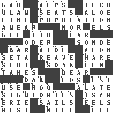 ACROSS 1. Slender fish 4. High mountains 8. Georgia ____ (Atlanta school) 12. Uhlan (variant) 14. Theater features 16. Medicinal plant 17. Actor's bit 18. Census information 20. Approach 22. Not either 23. Raised railways 24. Turn to the right 25. It would 28. Hearing organ 30. River in Europe 31. Message 35. Long, evenly shaped piece 37. Assistant 40. Age 41. Bristle 42. Break or tear apart 44. Female horse 45. Narrow, elongated depression 46. Neighbor of Neb. 47. Shade tree 48. Domesticates 50. Letter starter 52. Pat or tap gently 54. Begley and Asner 55. Eastern Standard Time (abbr.) 58. Purpose 61. Friend of Pooh 63. Having winglike extensions 65. Seigniories (variant) 70. Austrian river, tributary to the Danube 71. One of the Great Lakes 72. Moves on water 73. Snakelike fish 74. Remainder 75. "Death on the ____" 76. Area sheltered from the wind DOWN 1. Russian prison camp 2. Place in a line 3. Indian princess (variant) 4. Cleo's killer 5. Lion 6. Infant food 7. Surprise greatly 8. Make lace 9. Writer Wiesel 10. Calm and collected 11. Coop moms 13. Teachers' org. 15. A type of plum 19. Caspian sea tributary 21. To free from 26. Separate forcefully 27. Frees from moisture 29. Nomad 30. Spoke pompously 32. Be tempered by heat 33. Dormintory (informal) 34. Compass dir. 35. Actor Lugosi 36. Tiny particle 38. Male parent 39. Dodge 41. Fast jet (abbr.) 43. Made supply last 49. Indian skirt 51. White ___ sheet 53. Scornful sounds 55. Artist's stand 56. Having lost freshness 57. Laconic 58. One who uses or employs something 59. Beget 60. Armor plate that protects the chest 62. NW Algerian seaport 64. Falsehood 66. Fish or hair follower 67. One more than two 68. Pipe bend 69. Compass dir.