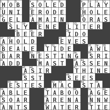 ACROSS 1. Disorderly crowd 4. Having a sole or soles 9. Romp 13. Single; one (prefix) 14. Wear away 15. Opening into or through something 16. Set 17. At full speed 18. Mouths or openings 19. Wily 21. Compass dir. 22. 61 cubic inches 24. Fermented drink made from hops 26. Wedding promise 27. Hold, grip (Informal) 29. Nights before holidays 30. Memphis, Tenn. Street 31. Periodic rise and fall of the sea level 33. Leather borer 36. Soap unit 37. Nestling 40. Indian title of respect (Mr.) 41. Increase 42. Vertical spar for supporting sails 43. NE Netherlands city 45. SW Saudi Arabia district 47. One or ones belonging to thee 48. Fast jet (abbr.) 49. Perceives with the eye 50. _____ Park, CO 52. Big _ 54. R.R. building 56. Competent 57. Off limits 59. Mature 61. Fly high 62. Sports stadium 63. Compass dir. 64. Pismires 65. Wetness 66. Standoff DOWN 1. Java container 2. Washington bills 3. Big road sign 4. Ocean 5. Abalone 6. Grant temporary use of 7. Singer Brickell 8. Lair 9. Pictures 10. Old wives' tales, e.g. 11. Having or resembling wings 12. Affirmative reply 20. Shout 22. Make or become more lively 23. Binary compound 25. Genesis locale 27. Swedish rock group 28. Froth on beer 29. Prepare for publication 31. Russian ruler of old 32. ___ a Wonderful Life 33. Aide 34. Songbird 35. Actor's bit 38. Gives off 39. Yard entry 44. "______ My Girl" (Turtles hit) 45. Michaelmas daisies 46. Compass dir. 49. Biscuitlike quick bread 50. Inky black, to poets 51. Narrow board 52. Hindu Mythology: god of death 53. Collude with 55. Hindu god of fire 56. White ___ sheet 57. The 23rd letter of the Hebrew alphabet 58. Rowing implement 60. She-sheep