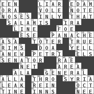 ACROSS 1. Car or cant ending 4. One who doesn't tell the truth 8. Dutch treat 12. Mouth or opening 13. Grand slam 14. Musical sound 15. Olfactory organs 18. In an inward manner 19. Not this but _ 20. Deli grouping 22. Lyricist Gershwin 23. Actor's bit 24. Enemy 25. Compass dir. 26. Flamboyance 30. White ___ sheet 33. Carrier 36. Loyal 37. Basketball hoops 39. ___ good deed 40. Shout 41. Afresh 42. _ dish (used to culture cells) 44. Raised railways 45. Legislator 47. Actress Charlotte 50. Fish or hair follower 51. Type of rug 53. In the manner of 54. Commissioned military rank 57. Silent film actress Nazimova 59. Through, poetically 61. Damascus' land 63. Path through which fluid escapes 64. It's straight from the horse's mouth 65. Sep. follower 66. Prong on a fork 67. Taverns 68. Born DOWN 1. Age 2. Greek god of love 3. Relating to the nose 4. 57 in ancient Rome 5. Charged particles 6. Everything 7. Marina Del _, California 8. Plea 9. Capital of the state of Qatar 10. "One Day ___ Time" 11. Was introduced to 16. Writer Wiesel 17. Without 21. Confront 22. Electrically charged atom 24. At a great distance 26. Lightbulb-shaped fruit 27. Algonquian 28. Frame or body of a ship 29. Snakelike fish 30. Caspian sea tributary 31. Trig term 32. So be it 34. River in Europe 35. Small child 38. Tchaikovsky ballet 42. Cooking vessel 43. SW Asia republic 46. Afternoon social gathering 48. Ancient Greek god of war 49. Suggestive of the supernatural 52. Composer Copland 53. Actor Alda or Thicke 54. Amused look 55. Immeasurably long periods of time 56. Louse (plural) 57. The first octave above the treble staff 58. Luau accessory 59. Three (prefix) 60. Layer 62. Had dinner