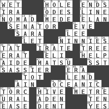ACROSS 1. Dripping 4. Hollow 8. Extremities 12. Lyricist Gershwin 13. Lyric poems 14. Actor's bit 15. Wanderer 18. Ancient Persian 19. Style 20. Elected representative 22. Night before a holiday 23. "Two Mules for Sister ____" 24. Area sheltered from the wind 25. Allow 26. Fools 30. Make lace 33. Feeling or showing extreme anger 36. Family _ (genealogy) 37. Part of Q.E.F. 39. Biblical high priest 40. Aid 41. Assistant 42. Taiwanese island in East China Sea 44. Fast jet (abbr.) 45. More lively and spirited 47. Epoch 50. Small child 51. Grant temporary use of 53. The 18th letter of the Arabic alphabet 54. Pertaining to the sea 57. Torque (variant) 59. Hub of activity 61. Distance measurement (Brit.) 63. Mountain range 64. An important port of Yemen 65. "___ Little Indians" 66. Comfort 67. Incision 68. Affirmative reply DOWN 1. Victory 2. Greek god of love 3. Makes less strong or intense 4. Like (prefix) 5. River in Europe 6. Directed 7. Compass dir. 8. Veterans Day date 9. Mediterranean tributary 10. Heredity factor (abbr.) 11. Elected rep. 16. Of or related to the anus 17. Have the gumption 21. Jacques of French films 22. Car or cant ending 24. Whopper 26. Nuclear Threat Initiatives 27. Angers 28. Snakelike fish 29. Back-to-school mo. 30. Afternoon social gatherings 31. Operatic vocal solo 32. Small boys 34. Hitchcock's "____ Window" 35. The first octave above the treble staff 38. A testis 42. Was introduced to 43. Ubangi River tributary 46. Electrically charged atom 48. 480, 500 or 516 sheets of paper 49. Singer Murray 52. Short, simple song 53. Caspian sea tributary 54. Baking chamber 55. Penny 56. Algonquian 57. Third day of the wk. 58. Mouth or opening 59. Possessed 60. Binary compound 62. Followers of ems