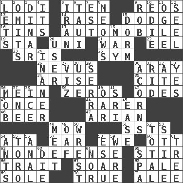 ACROSS 1. Farming town in central California 5. Detail 9. Vintage cars 13. Send forth 14. Raze (variant) 15. Evade 16. Metal containers 17. Form of transportation 19. R.R. building 20. Corn or form start 21. Armed conflict 22. Snakelike fish 23. Indian titles of respect 25. Symbol (abbr.) 26. Mole, birthmark 30. Like ___ of sunshine 34. Originate 35. Quote 36. Chow _ 39. Nothings 42. Lyric poems 43. Single time 44. More valued for its uncommonness 46. Fermented drink made from hops 47. Believer in; advocate of (suffix) 48. Cut the grass 51. Fast planes 54. "One Day ___ Time" 57. Ewer handle 58. She-sheep 60. Baseball player Mel 62. Unrelated to defense, as in spending 65. Use a swizzle stick 66. Distinguishing feature 67. Fly high 68. Light colored 69. Flatfish 70. Loyal 71. Toward shelter DOWN 1. Allows 2. Leaves out 3. Middle Eastern gold or silver currency 4. ___ a Wonderful Life 5. SW Asia republic 6. "Change" in Tahitian 7. Eastern Standard Time (abbr.) 8. Catcalls? 9. Director Reiner 10. Singer Brickell 11. Stare 12. Stitch closed the eyes of (a falcon) 15. Dormintory (informal) 18. Fifth month 20. One who makes use of a thing 24. Sillier 27. That is 28. Purpose 29. Spanish missionary in California 30. Oak nuts 31. To free from 32. Had dinner 33. It is so 36. Crowd into 37. Compass dir. 38. Frozen water 40. Boat paddle 41. Indian title of respect (Mr.) 45. Relaxation 48. Rendezvous 49. Clumsy lout 50. Obtain by seizing forcibly or violently 52. Add up to 53. Vertical member of a panel or frame 54. Pismires 55. "Corrida" creature 56. Of or related to the anus 58. Son of Isaac 59. We are 61. Woody plant 63. Pass on 64. Not either 65. Health resort