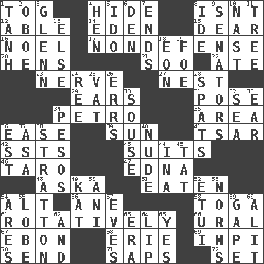 ACROSS 1. Coat; cloak 4. Flintstone garb 8. Is not 12. Competent 14. Locale of original sin 15. Letter starter 16. Christmas carol 17. Unrelated to defense, as in spending 20. Coop moms 21. "Barney Miller" actor Jack 22. Had dinner 23. Boldness 27. Egg locale 29. Hearing organs 31. Airs 34. Stone: prefix 35. Length times width 36. Relaxation 39. Player for Phoenix 41. Russian ruler of old 42. Fast planes 43. Sets of matching outer garments 46. Pacific island yam 47. Pulitzer Prize-winning author Ferber 48. "____ silly question..." 51. Eroded 54. The first octave above the treble staff 56. One (Scot) 58. Ancient Roman robe 61. Producing rotation 66. Mountain range 67. Inky black, to poets 68. One of the Great Lakes 69. Body of Kaffir warriors 70. Post 71. Plant excrements 72. Arrange properly for use DOWN 1. Hyperbolic tangent 2. Mitch Miller's instrument 3. American astronaut and politician John 4. Layer 5. Wedding promise 6. Lair 7. Extremities 8. Binary compound 9. Elected representatives 10. Political cartoonist Thomas 11. Relationship diagram 13. Otherwise 18. A really long time 19. Enemy 24. To sift 25. Large container 26. Blunders 28. Arguments over trivial matters 30. Boozer 32. Ocean 33. Hearing organ 34. Mexican monetary units 36. Eastern Standard Time (abbr.) 37. White ___ sheet 38. Ski resort town in Vermont 40. Naked 44. _ tizzy (2 wds.) 45. Make lace 49. Krazy ___ of comics 50. Cuckoo 52. Needle case 53. Typical models 54. Ancient Greek god of war 55. Ear part 57. Nights before holidays 59. Open wide 60. Came down and settled, as after flight 62. Also 63. Epoch 64. Mouth edge 65. It is so