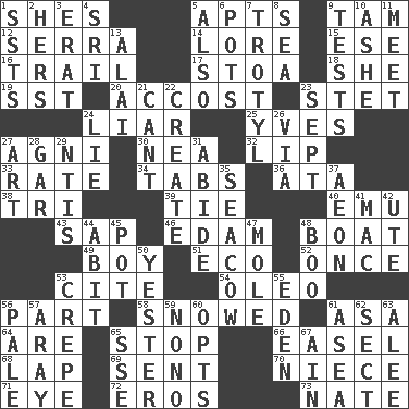 ACROSS 1. "______ My Girl" (Turtles hit) 5. Tenement units (abbr.) 9. Scottish cap 12. Spanish missionary in California 14. Old wives' tales, e.g. 15. Compass dir. 16. Lag or linger behind 17. Portico 18. A female animal or person 19. Fast jet (abbr.) 20. Buttonhole 23. Proofreading order 24. One who doesn't tell the truth 25. Jacques Cousteau's middle name 27. Hindu god of fire 30. Teachers' org. 32. Mouth edge 33. Assign a rank or rating to 34. Bar bills 36. _ moment's notice (2 wds.) 38. Three (prefix) 39. Make a knot 40. Australian flightless bird 43. Plant excrement 46. Dutch treat 48. Water vessel 49. Male child 51. Environmental prefix 52. At one time in the past 53. Quote 54. Butter sub 56. Component 58. Frozen precipiation fell 61. White ___ sheet 64. "We ___ not amused" (Victoria) 65. Constrict 66. Artist's stand 68. Pet locale 69. Transmitted 70. Sibling's daughter 71. Sight organ 72. Greek god of love 73. Nathan's nickname DOWN 1. Fast planes 2. Possessive pronoun 3. Part of Q.E.F. 4. _ Lanka 5. In addition 6. Plant holders 7. Trinitrotoluene 8. Ocean 9. Trials 10. American tennis player Robert 11. Confront 13. Jai _ 21. Patter 22. Make 23. Back-to-school mo. 24. Whopper 26. By way of 27. Nonscientific branch of learning 28. Slender fish 29. Nuclear Threat Initiatives 31. Tolerate 35. Manatee 37. Period of immesurable duration 41. Apple computer (short form) 42. Shoshoni 44. "This won't hurt ____!" 45. Cooking vessel 47. Undercover agent 48. Sometimes accompanies a hiss 50. Last past 53. Streamer paper 55. Genesis locale 56. Light colored 57. Like ___ of sunshine 59. Words to Nanette 60. Chooses 61. Toward the sea 62. Religious group 63. Toward shelter 65. Compass dir. 67. The 18th letter of the Arabic alphabet