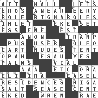ACROSS 1. Small island 4. Promenade 8. Allows 12. Greek god of love 14. Approach 16. Suggestive of the supernatural 17. Hero or heavy, e.g. 18. Complicated, petty procedures 20. An arm off of a larger body of water 22. Make supply last 23. Arrange properly for use 24. Curvy letter 25. Compass dir. 28. Eastern Standard Time (abbr.) 30. Soon (poet.) 31. _____ steamer (cargo ship) 35. Ichor 37. One who makes use of a thing 40. Margarine 41. Haul 42. Unadorned figures 44. Portable shelter 45. Brightly colored fish 46. He sold his birthright 47. Consenting reply 48. Insides of hands 50. Small bottle 52. Auto club (abbr.) 54. And so on (abbr.) 55. Mouth or opening 58. Biblical high priest 61. Retirement account (abbr.) 63. Artist's stand 65. Dwellings 70. Port city in Latvia 71. Table seasoning 72. Gospel singer Marvin 73. Penny 74. Supplemented with great effort 75. Songbird 76. Actress Charlotte DOWN 1. Nest on high 2. Metal shackles 3. For Whom the Bell _____ 4. Spoil 5. Black tropical American cuckoo 6. Part of a journey 7. Unable to walk 8. Lion 9. Snakelike fish 10. Relationship diagram 11. System (abbr.) 13. Perceive with the eye 15. Immoral or dissolute person 19. Relief 21. Nine, plus one 26. Part of speech 27. Follow as a consequence or result 29. Trinitrotoluene 30. Respiratory problem 32. Toward shelter 33. Not women's 34. Plant holder 35. Dad 36. Mountain range 38. Begley and Asner 39. Rob, plunder, or pillage 41. Police officer (slang) 43. Set or collection 49. Alleged 51. Adept person 53. Ancient Greek god of war 55. Flexible twig of a willow tree 56. Rain (Swedish) 57. Having winglike extensions 58. Celtic language 59. Path through which fluid escapes 60. Capri or Wright 62. Afresh 64. Curve 66. It would 67. Automobile 68. Compass dir. 69. Elected rep.