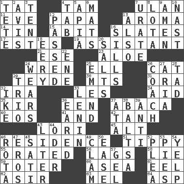 ACROSS 1. Make lace 4. Scottish cap 7. Uhlan (variant) 11. Night before a holiday 12. Dad 13. Scent 14. Metal container 15. "This won't hurt ____!" 16. Chalkboards 17. _____ Park, CO 19. Aide 21. Compass dir. 23. _ vera 24. Songbird 25. Pipe bend 26. Feline 29. Miss Universe 1986, Barbara Palacios _ 30. Mountains (abbr.) 31. Mouth or opening 32. Lyricist Gershwin 33. French article 34. Help 35. Apertif with cassis 36. Car or cant ending 37. Phillipine bananalike plant 40. Greek goddess of the dawn 41. Plus 42. Hyperbolic tangent 43. Australian parrot (variant) 45. The first octave above the treble staff 46. Home 51. Likely to tip or tilt 55. Spoke pompously 56. Falls behind 58. Whopper 59. Carrier 60. At sea 61. Snakelike fish 62. SW Saudi Arabia district 63. Cartoonist voice _ Blanc 64. Cleo's killer DOWN 1. Wig 2. Opinion 3. Portable shelter 4. Bar bill 5. Capital of Western Samoa 6. Floor protectors 7. A salt of uric acid 8. Globular water bottle used in Asia 9. So be it 10. Political cartoonist Thomas 12. Went by 13. In addition 16. Beverly of Met fame 18. Suggestive of the supernatural 20. Table seasonings 22. Compass dir. 24. Erodes 25. Make improvements or corrections to 26. Team commander 27. Operatic vocal solo 28. Small boy 29. Musical group of three 32. Eisenhower's nickname 33. Soviet premier 1918-24 36. Having ears or earlike features 37. "One Day ___ Time" 38. Greek mezzo-soprano Agnes 39. Against 43. 61 cubic inches 44. River in Europe 46. Roll call or roster of names 47. Greek god of love 48. Suttee (variant) 49. Burrowing marine mollusk 50. Comfort 52. Entreaty 53. Sliced desserts 54. Sharp bark 57. Set