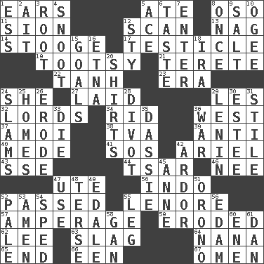 ACROSS 1. Hearing organs 5. Had dinner 8. Bear (Spanish) 11. The Jewish people; Israel 12. Examine minutely or intensely 13. Tired old horse 14. Moe Howard, for one 17. One of the two male reproductive glands 19. Tootsie (variant) 21. Cylindrical with tapered ends 22. Hyperbolic tangent 23. Period 24. A female animal or person 27. Put down 29. French article 32. Domineers 34. To free from 36. 270 degrees 37. Mine, in Marseilles 38. Federal power corp. 39. Opposed to 40. Ancient Persian 41. Distress signal 42. Satellite of Uranus 43. Compass dir. 44. Russian ruler of old 46. Born 47. Shoshoni 50. _ china 52. Went by 55. Poe poem 57. Electrical Measurement 59. Worn away 62. Area sheltered from the wind 63. Volcanic refuse 64. Nanny 65. Conclusion 66. Car or cant ending 67. Sign of something about to happen DOWN 1. Curvy letter 2. Small island 3. Carrot, for example 4. Snout, nose 5. Adept person 6. Clothes sense 7. Keyboard key 8. At one time in the past 9. Table seasoning 10. Double curve, resembling the letter S 12. Filthy place 15. Scores awarded for successful feats 16. Inactive volcano in Sicily 18. Lyricist Gershwin 20. Chest coverings 24. Criticizes harshly 25. Dwellings 26. Wear away 28. A piece of turf (Scot.) 29. Soviet premier 1918-24 30. First name in cosmetics 31. Vertical member of a panel or frame 33. Pass on 35. Small ungulate mammals of Africa 36. Armed conflict 42. Zeal 45. Queen of England 1702-14 47. Purpose 48. Laconic 49. Peak District village in England 51. U. of Maine site 52. Diluted with white 53. So be it 54. Moved rapidly 55. Part of a journey 56. Dutch treat 58. Separate the seeds from cotton 60. Compass dir. 61. One of the 12 tribes of Israel