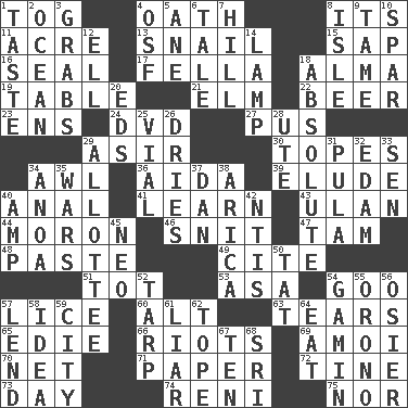 ACROSS 1. Coat; cloak 4. Pledge 8. ___ a Wonderful Life 11. Measure of real estate 13. Slow-paced one 15. Plant excrement 16. Lick closed 17. Chap (slang) 18. _ mater 19. Eating place 21. Shade tree 22. Fermented drink made from hops 23. Followers of ems 24. Movie disc 27. Tenth month of the Hindu calendar 29. SW Saudi Arabia district 30. Drinks excessively 34. Leather borer 36. Opera by Verdi 39. Dodge 40. Of or related to the anus 41. Memorize 43. Uhlan (variant) 44. Person of subnormal intelligence 46. In a ____ (agitated or irritated) 47. Scottish cap 48. Thick mixture 49. Quote 51. Small child 53. White ___ sheet 54. Thick or sticky substance 57. Louse (plural) 60. Keyboard modifier key 63. Pulls into pieces 65. Singer Brickell 66. Disturbances 69. Mine, in Marseilles 70. Fish or hair follower 71. Some stationery 72. Prong on a fork 73. 24 hours 74. Painter Guido (1575-1642) 75. Not either DOWN 1. Clothes sense 2. Sea 3. Seizes 4. Order of Saint Francis (abbr.) 5. A saturated hydrocarbon 6. Falsehood 7. Land elevation 8. Capri or Wright 9. Not wild 10. Coast Guard woman 12. Pipe bend 14. Desk light 18. Utter; complete 20. Begley and Asner 25. Small bottle 26. Frees from moisture 28. Shoshoni 29. One to whom something is allotted 31. Monetary unit of Botswana 32. Dutch treat 33. Elected rep. 34. Small Philippine buffalo 35. Armed conflicts 37. One of the 12 tribes of Israel 38. N. Chile seaport 40. Electrical Unit 42. Nuclear Threat Initiatives 45. Modern: prefix 50. Make lace 52. Canvas cover 54. Homeless child 55. U. of Maine site 56. Flexible twig of a willow tree 57. Grant temporary use of 58. The main thing one is thinking about 59. Municipality 61. One who doesn't tell the truth 62. Drink excessively 64. Consume 67. "___ Little Indians" 68. Indian title of respect (Mr.)