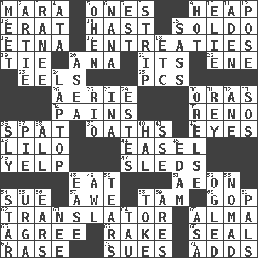 ACROSS 1. Hindu Mythology: god of death 5. Singles 9. Pile 13. Part of Q.E.F. 14. Vertical spar for supporting sails 15. Twentieth part of a lira 16. Inactive volcano in Sicily 17. Pleas 19. Standoff 20. Santa ___, CA 21. ___ a Wonderful Life 22. Compass dir. 23. Snakelike fish 25. Personal Computers (abbr.) 26. Nest on high 30. Mouths or openings 34. Aches 35. Former U.S. Attorney General Janet 36. Petty quarrel 39. Profane or obscene expressions 42. Sight organs 43. _ and Stitch 44. Artist's stand 46. Sharp bark 47. Bobsleighs 48. Ingest 51. Period of immesurable duration 54. Institute legal proceedings 57. Deep reverence 58. Scottish cap 60. Republican Party 62. Interpreter 65. _ mater 66. Match 67. Immoral or dissolute person 68. Lick closed 69. Raze (variant) 70. Institutes legal proceedings 71. Sums up DOWN 1. Rendezvous 2. Nick name for Arthur 3. Indian princess (variant) 4. _ moment's notice (2 wds.) 5. Sign of things to come 6. Grandmother 7. Eastern Standard Time (abbr.) 8. Long narrow piece of something 9. Being at a high temperature 10. Writer Wiesel 11. Arabian gulf 12. Airs 15. Backtalk 18. And so on (abbr.) 20. Toward the sea 24. Portable computer 27. River (Sp.) 28. _ tizzy (2 wds.) 29. _____ Park, CO 30. Threatening words 31. Marina Del _, California 32. One (Scot) 33. Mayday 36. Wily 37. Sliced dessert 38. 100% 40. Actor Linden 41. Compass dir. 45. Dutch treat 48. Comfort 49. Leather borer 50. Separates forcefully 52. Stared 53. Roamer 54. Play the lead 55. Capital and largest city of Mongolia 56. Hearing organs 58. Casino tip 59. Ancient Greek god of war 61. Friends 63. Born 64. The 19th letter of the Greek alphabet 65. White ___ sheet
