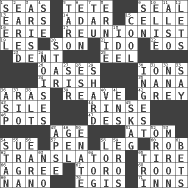 ACROSS 1. Oceans 5. False hair 9. Lick closed 13. Hearing organs 14. The sixth month of the Jewish calendar 15. Cell (Danish) 16. 4th largest of the Great Lakes 17. One who advocates reunion 19. French article 20. Manchild 21. Wedding promise 22. Greek goddess of the dawn 23. Gouge 25. Snakelike fish 26. Fertile tracts in a desert 30. Charged particles 34. From or relating to Ireland 35. Nanny 36. Caspian sea tributary 39. Break or tear apart 42. Jennifer or Joel 43. Filth; sediment 44. Wash lightly 46. Cooking vessels 47. Writing tables 48. Personal question 51. Tiny particle 54. Institute legal proceedings 57. Fenced enclosure 58. Part of a journey 60. Director Reiner 62. Interpreter 65. Become fatigued 66. Match 67. "Corrida" creature 68. Carrot, for example 69. Billionth: prefix 70. The front part of a cuirass 71. Restaurants DOWN 1. Sew up the eyelids of hawks and falcons 2. Having ears or earlike features 3. Originate 4. Compass dir. 5. Pacific island yam 6. Genesis locale 7. The 19th letter of the Greek alphabet 8. Bert's buddy 9. Elected rep. 10. Writer Wiesel 11. In addition 12. Allows 15. Calm and collected 18. Binary compound 20. Play the lead 24. Annoying sounds 27. Title for a knight 28. Compass dir. 29. Pottery fragment 30. Swallow 31. Rowing implement 32. Compass dir. 33. Declare 36. Cleo's killer 37. River (Sp.) 38. Keyboard modifier key 40. Compete 41. Followers of ems 45. Heroin 48. Domed church section 49. Set 50. Maternal 52. Greek mythologigal hunter 53. Person of subnormal intelligence 54. Comedian Laurel of Laurel & Hardy 55. Capital and largest city of Mongolia 56. Merit 58. Australian parrot (variant) 59. Greek god of love 61. Wagers 63. Modern: prefix 64. Coat; cloak 65. Three (prefix)