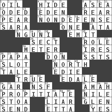 ACROSS 1. Lubricate 4. Flintstone garb 8. At sea 12. Wrote a lyric poem 14. Paradise 15. Rump 16. Lightbulb-shaped fruit 17. Unrelated to defense, as in spending 20. "Two Mules for Sister ____" 21. Single 22. _ moment's notice (2 wds.) 23. Group of southern Bantu languages 27. Give off 29. Religious group 31. Hero or heavy, e.g. 34. Distance measurement 35. Angers 36. Dad 39. Spanish title 41. Fast planes 42. Narrow, elongated depression 43. Compass direction 46. Lie 47. Singer Brickell 48. Loyal 51. Peak District village in England 54. Slender fish 56. Overdraft (abbr.) 58. Nursemaid 61. Appease 66. "Death on the ____" 67. Portico 68. One who doesn't tell the truth 69. Small, secluded valley 70. Post 71. Singer James 72. It is so DOWN 1. I made a mistake 2. The content of cognition 3. Memorize 4. Layer 5. Wedding promise 6. Lair 7. Inside; within (prefix) 8. "We ___ not amused" (Victoria) 9. Legislators 10. Compass direction 11. Length times width 13. To draw with force 18. Compass dir. 19. Opposite of masc. 24. Purpose 25. Fish or hair follower 26. On the rocks 28. From or relating to Ireland 30. Heavy duty weighing machine 32. Allow 33. Curvy letter 34. Mother 36. Pacific Standard Time (abbr.) 37. According to 38. Characterized by complete cowardliness 40. Thickened enlargement 44. To free from 45. Beverage made from leaves 49. University (slang) 50. Eastern Standard Time (abbr.) 52. Austrian-born American filmmaker Fritz 53. Poet Dickinson 54. Global Positioning Systems (abbr.) 55. Johnson of "Laugh-In" 57. Do some clerical work 59. Toward shelter 60. Coop moms 62. Groovy apt. 63. Small island 64. Make lace 65. Epoch