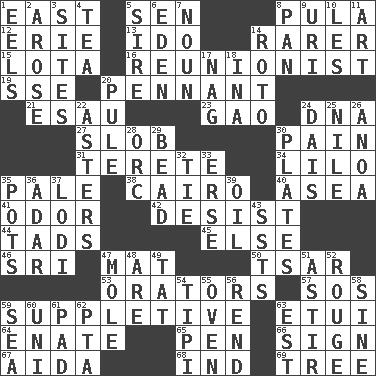 ACROSS 1. 90 degrees 5. Elected rep. 8. Monetary unit of Botswana 12. 4th largest of the Great Lakes 13. Wedding promise 14. Less widely known 15. Globular water bottle used in Asia 16. One who advocates reunion 19. Compass dir. 20. Pre-World Series prize 21. He sold his birthright 23. E Mali city 24. Heredity factor (abbr.) 27. Oscar Madison type 30. Ache 31. Cigar-shaped 34. _ and Stitch 35. Diluted with white 38. Capital of Egypt 40. At sea 41. Aroma 42. Stop 44. Bits 45. Otherwise 46. _ Lanka 47. Floor covering 50. Russian ruler of old 53. Speakers 57. Distress signal 59. Supplementary 63. Needle holder 64. Maternal 65. Writing instrument 66. Attach a signature 67. Opera by Verdi 68. Working for oneself (abbr.) 69. Family _ (genealogy) DOWN 1. Snakelike fish 2. Came up 3. Settings 4. Afternoon social gathering 5. The founder of a family 6. Genesis locale 7. Part of speech 8. Baking dish 9. RI univ. 10. French article 11. Nonscientific branch of learning 14. Printing process, for short 17. Tired old horse 18. _ tizzy (2 wds.) 20. Whimper 22. Michaelmas daisies 24. Raised platform 25. The longest river in the world 26. Small Philippine buffalo 28. The grampus (Milton) 29. Necklace unit 30. Food holders 32. Neckwear 33. Celtic language 35. Cooking vessels 36. The sixth month of the Jewish calendar 37. Farming town in central California 39. Petroleum 43. Fast planes 47. Undercover agent 48. "We ___ not amused" (Victoria) 49. Make lace 51. Moving about 52. Makeup applied to the cheeks 54. Native american tent (variation) 55. Baking chamber 56. Tear apart 58. Trig term 59. Ocean 60. Single; one (prefix) 61. Groovy apt. 62. Parent Teacher Association (abbr.) 63. Eastern Standard Time (abbr.)