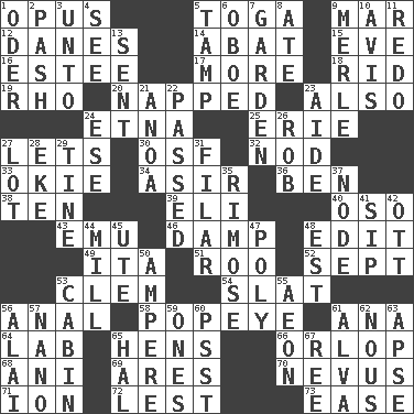 ACROSS 1. Musical composition 5. Ancient Roman robe 9. Third mo. 12. Natives or inhabitants of Denmark 14. Blind as ____ 15. First lady 16. First name in cosmetics 17. Greater amount 18. To free from 19. 17th letter of the Greek alphabet 20. Slept 23. In addition 24. Inactive volcano in Sicily 25. One of the Great Lakes 27. Allows 30. Order of Saint Francis (abbr.) 32. Lower and raise head in agreement 33. Migrant worker of the '30s 34. SW Saudi Arabia district 36. Benjamin's nick name 38. "___ Little Indians" 39. Connecticut Ivy Leaguer 40. Bear (Spanish) 43. Australian flightless bird 46. Moist 48. Prepare for publication 49. Call ___ day 51. Friend of Pooh 52. Back-to-school mo. 53. To starve (Brit.) 54. Narrow board 56. Of or related to the anus 58. Wimpy's pal 61. Santa ___, CA 64. Experiment locale 65. Coop moms 66. Lowest deck of a ship 68. Black tropical American cuckoo 69. Ancient Greek god of war 70. Congenital growth or mark on the skin 71. Electrically charged atom 72. For fear that 73. Relaxation DOWN 1. River in Europe 2. Romantic infatuation 3. To (old English) 4. Observe 5. Pack (down) 6. Mitch Miller's instrument 7. Place where plants grow 8. Had dinner 9. Haggard of country music 10. Advice 11. Make new 13. Emitted 21. Small Philippine buffalo 22. Went by 23. Assistant 24. Compass dir. 26. Director Reiner 27. Car dealer's back yard 28. Make supply last 29. Prong on a fork 31. Having threads 35. Full of chinks, cracks, or crevices 37. Thickened enlargement 41. Small drink 42. Baseball player Mel 44. Place where flour is made 45. Shoshoni 47. Many (prefix) 48. Eastern Standard Time (abbr.) 50. Electrical Unit 53. Small house or cottage 55. Age 56. Jai _ 57. Billionth: prefix 59. Washington bills 60. Inconspicuous attention getter 61. Inventor's middle name 62. Common sense 63. Domed church section 65. Actor Linden 67. To separate or throw off