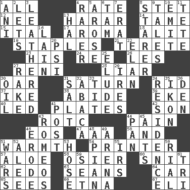 ACROSS 1. Everything 4. Assign a rank or rating to 8. Proofreading order 12. Born 13. Ethiopian city, capital of Harari 14. Not wild 15. Slanted text style (abbr.) 17. Odor 18. Set down 19. Paper fasteners 21. Cylindrical with tapered ends 23. Part of HMS, perhaps 24. To riddle 26. French article 27. Painter Guido (1575-1642) 28. One who doesn't tell the truth 30. Boat paddle 31. Titan orbits this 34. To free from 37. Mamie's mate 38. Remain 39. Make supply last 40. Directed 41. Food holders 42. Manchild 43. College mil. group 44. Ache 46. Greek goddess of the dawn 47. Auto club (abbr.) 50. Also 51. Heat 54. Hard copy producer 57. Medicinal plant 58. Flexible twig of a willow tree 60. In a ____ (agitated or irritated) 62. Do over again 63. Actors Connery and Penn 64. Automobile 65. Perceives with the eye 66. Inactive volcano in Sicily 67. Biblical high priest DOWN 1. Cuckoo 2. Allows 3. Resembling or made to resemble leather 4. More valued for its uncommonness 5. Came up 6. Scottish cap 7. Part of Q.E.F. 8. A viewer who gazes fixedly 9. Falsehoods 10. Send forth 11. False hair 13. Actor Linden 16. (Had) reclined 20. 23rd letter of the Greek alphabet 22. Enthusiasm 25. Evade 27. Immoral or dissolute person 29. Angers 30. Petroleum 31. Table seasoning 32. Phillipine bananalike plant 33. Teat (slang) 34. Dwelling 35. Visual representation of an object 36. Lair 41. Mail 43. Lover boys 44. Baking dish 45. Pismires 46. Eat (away) 48. Bee-related 49. Sports stadium 51. Armed conflicts 52. Toward shelter 53. Stockings 55. Big collection agency 56. Monetary unit of Yemen 59. Put into a specified state 61. Three (prefix)