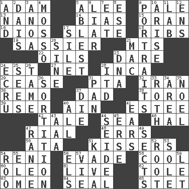 ACROSS 1. First man 5. Toward shelter 9. Light colored 13. Billionth: prefix 14. Prejudice 15. NW Algerian seaport 16. "Vaya con ____" 17. Chalkboard 18. Chest bones 19. More lively and spirited 21. Mountains (abbr.) 22. Lubricates 23. Have the gumption 24. Eastern Standard Time (abbr.) 27. Fish or hair follower 28. South American Indian 29. Desist 31. Parent Teacher Association (abbr.) 32. SW Asia republic 36. San ____ (Riviera town) 37. June honoree 38. "Corrida" creature 39. One who uses or employs something 40. The 18th letter of the Arabic alphabet 41. First name in cosmetics 42. Story 44. Ocean 46. Actor Linden 47. Monetary unit of Yemen 48. Blunders 50. "One Day ___ Time" 51. Smoochers 54. Painter Guido (1575-1642) 56. Elude 58. Calm and collected 60. Margarine 61. Moving, as bait 62. Lacquered or enameled metalware 63. Sign of things to come 64. Lick closed 65. Proofreading order DOWN 1. Added to 2. Raised platform 3. Small Philippine buffalo 4. With motion or animation 5. Most capable 6. One who doesn't tell the truth 7. Ingest 8. Compass dir. 9. Likenesses of persons 10. Get up 11. Experiment locale 12. Followers of ems 17. Filth; sediment 20. Trig term 21. Apple computer (short form) 23. Heredity factor (abbr.) 24. Shade of tan 25. Perceives with the eye 26. Not wild 28. It would 30. Drawing lots 31. Baking dish 33. Writer of Portnoy's Complaint (1969) 34. Type of rug 35. Christmas carol 37. Pass on 40. 100% 41. Hearing organs 43. Auto club (abbr.) 44. A glass for beer 45. Celtic language 47. Indian princess (variant) 49. Religious groups 51. Polynesian shrub of the pepper family 52. Carrot, for example 53. Flatfish 54. Friend of Pooh 55. Shade tree 56. Raised railways 57. Compete 59. Allow