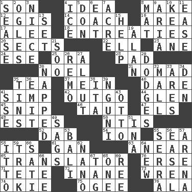 ACROSS 1. Male offspring 4. The main thing one is thinking about 8. Create 12. Armor plate that protects the chest 14. Team commander 16. Type of rug 17. Toward shelter 18. Pleas 20. Religious groups 22. Pipe bend 23. A saturated hydrocarbon 24. Compass dir. 25. Mouth or opening 28. Writing tablet 30. Christmas carol 31. Roamer 35. Afternoon social gathering 37. Count _ (2 wds.) 40. Have the gumption 41. Simple or foolish person 42. Money paid out 44. Small, secluded valley 45. Clip 46. Pulled tight 47. Raised railways 48. _____ Park, CO 50. Nuclear Threat Initiatives 52. Apply (a substance) by light strokes 54. Electrically charged atom 55. Ocean 58. It is 61. Separate the seeds from cotton 63. Approach 65. Interpreter 70. Celtic language 71. Wig 72. Empty; void 73. Songbird 74. Migrant worker of the '30s 75. Double curve, resembling the letter S 76. Chicken ___ king DOWN 1. Gospel singer Marvin 2. Stares at amorously 3. Sibling's daughter 4. Frozen water 5. Spanish title 6. Consume 7. 1/640 square mile 8. Floor protector 9. Operatic vocal solo 10. Peachy ____! 11. Comfort 13. Put into a specified state 15. Assist 19. Actor Alda or Thicke 21. "Barney Miller" actor Jack 26. San ____ (Riviera town) 27. Native American of Southwest Alaska 29. Evades 30. Slept 32. Promenade 33. Ancient Greek god of war 34. Lair 35. Metal containers 36. Send forth 38. Call ___ day 39. Group of southern Bantu languages 41. Compass dir. 43. "Beetle Bailey" pooch 49. Settles 51. _ tizzy (2 wds.) 53. Indonesian resort city 55. Spanish missionary in California 56. Artist's stand 57. Sports stadium 58. "Tell ____ the Marines!" 59. Long journey 60. Suttee (variant) 62. Billionth: prefix 64. ___ Haven, CT 66. Born 67. Label 68. Single 69. Portuguese money of account (variant)