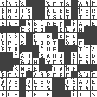 ACROSS 1. Backtalk 5. Puts into a specified state 9. A saturated hydrocarbon 12. Gives off 14. Toward shelter 15. For each 16. Wanderer 17. Is not 18. One more than two 19. Small drink 20. Remained 23. Light colored 24. Made supply last 25. Style 27. Straggles 30. Flaplike covering 32. Lair 33. Musical composition 34. A blast of a horn 36. Order of Saint Francis (abbr.) 38. Parent Teacher Assoc. 39. Third day of the wk. 40. Call ___ day 43. Third mo. 46. Indian skirt 48. Downhill vehicle 49. Chewing product 51. It is so 52. Froth on beer 53. Leg joint 54. Hyperbolic tangent 56. Painter Guido (1575-1642) 58. Electrical Unit 61. Take to court 64. "___ Maria" 65. Butter sub 66. Sadhe (variant) 68. Make a knot 69. Sliced desserts 70. "_____ Recall" 71. Raised railways 72. Wig 73. Petroleums DOWN 1. Elected reps. 2. Mine, in Marseilles 3. Simple or foolish person 4. R.R. building 5. Alleged 6. Otherwise 7. Watched over 8. Arrange properly for use 9. Bee-related 10. Famous astronaut Armstrong 11. 4th largest of the Great Lakes 13. Neighbor of Neb. 21. Waist strap 22. Foolish or stupid persons 23. Zero-star reviews 24. Curvy letter 26. Lion 27. Chop off 28. Fitting 29. Island territory of the United States 31. A city in N France, SE of Calais 35. Cigar-shaped 37. Do some clerical work 41. Afternoon social gathering 42. Say or write further 44. Hindu god of fire 45. Regret 47. Austrian river, tributary to the Danube 48. Quiet! 50. Ear of corn 53. Leg joints 55. Remaining after all deductions 56. Pace 57. Morally bad or wrong 59. Rendezvous 60. Airs 61. Suttee (variant) 62. Allodial 63. Snakelike fish 65. Elect 67. "Barney Miller" actor Jack