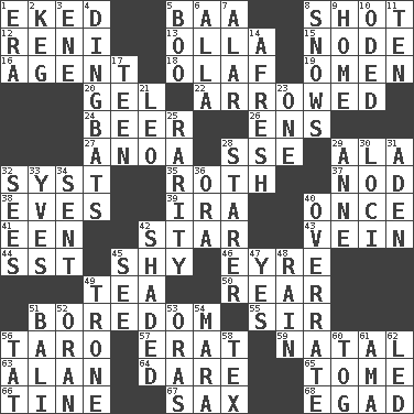 ACROSS 1. Supplemented with great effort 5. Sound made by sheep 8. Went for two points 12. Painter Guido (1575-1642) 13. Spanish pot 15. Thickened enlargement 16. Representative 18. Norwegian king 19. Sign of things to come 20. Set 22. Moved like an arrow 24. Fermented drink made from hops 26. Followers of ems 27. Small Philippine buffalo 28. Compass dir. 29. In the manner of 32. System (abbr.) 35. Writer of Portnoy's Complaint (1969) 37. Allow head to fall sleepily 38. Nights before holidays 39. Retirement account (abbr.) 40. At one time in the past 41. Car or cant ending 42. Play the lead 43. Distinctive style or manner 44. Fast jet (abbr.) 45. Like a shrinking violet 46. Jane of fiction 49. Afternoon social gathering 50. Located in or toward the back 51. Mood resulting from idleness 55. Title for a knight 56. Pacific island yam 57. Part of Q.E.F. 59. Relating to or accompanying birth 63. ____ Jay Lerner 64. Have the gumption 65. Heavy book 66. Prong on a fork 67. Saxophone 68. Mild oath DOWN 1. Period 2. Barrel 3. Compass dir. 4. Empty-headed or silly people 5. Surprise greeting 6. Silent film actress Nazimova 7. Having or resembling wings 8. Overwhelms 9. Residence 10. Wrote a lyric poem 11. Nine, plus one 14. Anew 17. Adolescent 21. Lion 23. Single 25. Noteworthy scarcity 28. A viewer who gazes fixedly 29. Singer Murray 30. Venues 31. Arabian gulf 32. Perceives with the eye 33. Jacques Cousteau's middle name 34. Emitted 36. Mouth or opening 40. Make much ado about nothing 42. Cast a shadow over 45. Perceive with the eye 47. Consenting reply 48. Precipitation 49. Heavy duty weighing machine 51. Indonesian resort city 52. Northwest Algerian city 53. Mouths or openings 54. Hindu Mythology: god of death 56. Make lace 58. John Ritter's dad 60. Coat; cloak 61. Nursemaid (var.) 62. Directed