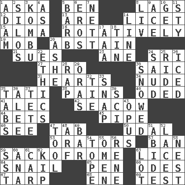 ACROSS 1. "____ silly question..." 5. Benjamin's nick name 8. Fails to keep up a pace 12. "Vaya con ____" 13. "We ___ not amused" (Victoria) 14. It is permitted: Lat. 15. _ mater 16. Producing rotation 19. Disorderly crowd 20. Refrain by choice 21. Takes to court 23. One (Scot) 24. Indian title of respect (Mr.) 27. Through, poetically 30. Ketch in the Levant 31. Centers 34. Naked 35. Jacques of French films 38. Aches 40. Wrote a lyric poem 41. Actor Baldwin 42. Manatee 44. Wagers 45. Corncob 46. Perceive with the eye 47. Bar bill 50. Freehold land 53. Speakers 57. Forbid 59. Italian handbag shop? 63. Louse (plural) 64. Slow-paced one 65. Animal enclosure 66. Lyric poems 67. Canvas cover 68. Compass dir. 69. Trial DOWN 1. First of billions? 2. Grain storage towers 3. Dried seaweed eaten as food 4. White ___ sheet 5. Sharp remark 6. Greek god of love 7. Remaining after all deductions 8. 54 in ancient Rome 9. Adept person 10. Set 11. Filthy place 14. Actor's bit 17. American Automobile Association (abbr.) 18. Metal container 20. American tennis player Robert 22. Moral principles 24. Saudi Arabian king (1953-1964) 25. Travel on or in a vehicle 26. On the rocks 28. Reproach for some lapse or misdeed 29. Mouths or openings 30. Overwhelmed 32. Neckwear 33. Fastener 35. Bar bills 36. Toward shelter 37. Wig 39. _-fi 43. Musical composition 47. Implement 48. Sandy's bark 49. Soap unit 51. Stay 52. Shoestrings 54. Drink excessively 55. Sign of something about to happen 56. French philosopher Descartes 58. A home for chicks 59. Fast jet (abbr.) 60. Santa ___, CA 61. Auto 62. Sleep 63. Car dealer's back yard