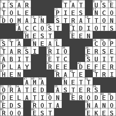 ACROSS 1. Austrian river, tributary to the Danube 5. Make lace 8. Purpose 11. Lacquered or enameled metalware 12. Sliced desserts 13. Non-commissioned officer (abbr.) 14. Realm 17. Ski resort town in Vermont 19. Buttonhole 21. Foolish or stupid persons 22. Command 23. Car or cant ending 24. R.R. building 27. Be tempered by heat 29. Police officer (slang) 32. Tarsus (plural) 34. _ de Janeiro 36. Celtic language 37. "This won't hurt ____!" 38. And so on (abbr.) 39. Set of matching outer garments 40. Shaw product 41. To separate or throw off 42. Put off 43. Layer 44. Pace 46. Three (prefix) 47. Nanny (var.) 50. Remaining after all deductions 52. Declaimed 55. Michaelmas daisies 57. Accusation by an informer 59. Eaten away 62. Begley and Asner 63. Roll call or roster of names 64. Billionth: prefix 65. Friend of Pooh 66. Eastern Standard Time (abbr.) 67. Supplements with great effort DOWN 1. It would 2. "Barney Miller" actor Jack 3. _ mater 4. Arrive at 5. Teat (slang) 6. Nest on high 7. Sadhe (variant) 8. To (old English) 9. Highlander 10. Immeasurably long periods of time 12. Pacific Standard Time (abbr.) 15. Ancient Celtic tribe of eastern Britain 16. Characteristic smell of wine 18. Metal container 20. A viewer who gazes fixedly 24. Staphylococcus 25. Eating place 26. Believer in; advocate of (suffix) 28. 61 cubic inches 29. An unpleasant substance 30. Flexible twig of a willow tree 31. _ dish (used to culture cells) 33. Filthy place 35. Seas 36. Compass dir. 42. Prevent from occurring 45. Wig 47. "One Day ___ Time" 48. Distance measurement (Brit.) 49. Goodbye (Sp.) 51. Marketplace scale 52. River in Europe 53. Redecorate 54. In addition 55. Santa ___, CA 56. Neighbor of Neb. 58. Baseball player Mel 60. Compass dir. 61. Two (Sp.)