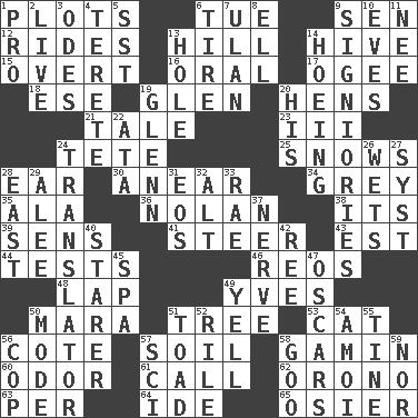 ACROSS 1. Graphs 6. Third day of the wk. 9. Elected rep. 12. Amusement-park features 13. Land elevation 14. Hub of activity 15. Unconcealed 16. Spoken 17. Double curve, resembling the letter S 18. Compass dir. 19. Small, secluded valley 20. Coop moms 21. Falsehood 23. One more than two 24. False hair 25. Overwhelms 28. Ewer handle 30. Approach 34. Jennifer or Joel 35. Chicken ___ king 36. Pitcher Ryan 38. ___ a Wonderful Life 39. Elected reps. 41. Navigate 43. Eastern Standard Time (abbr.) 44. Trials 46. Vintage cars 48. Pet locale 49. Jacques Cousteau's middle name 50. Hindu Mythology: god of death 51. Woody plant 53. Domesticated feline 56. ____ d'Azur (French Riviera) 57. Earth 58. Street urchin 60. Aroma 61. Give a ring to 62. U. of Maine site 63. For each 64. Binary compound 65. Flexible twig of a willow tree DOWN 1. Adept person 2. Moving, as bait 3. Lyric poems 4. Cigar-shaped 5. Fast jet (abbr.) 6. Become fatigued 7. ____ Bator, Mongolia 8. Pipe bend 9. Seigniories (variant) 10. Nights before holidays 11. Born 13. Hollow 14. Weeding 19. American astronaut and politician John 20. Part of HMS, perhaps 22. "One Day ___ Time" 24. Interpreter 26. Moistens 27. System (abbr.) 28. Compass direction 29. Toward shelter 31. Greek goddess of the dawn 32. Keyboard modifier key 33. Actress Charlotte 37. Effrontery 40. A viewer who gazes fixedly 42. To separate or throw off 45. Health resort 47. Motion picture awards 49. Shout 50. Method 51. Frog relative 52. Cause heat under the collar 54. Mine, in Marseilles 55. Prong on a fork 56. Police officer (slang) 57. _-fi 58. Thick or sticky substance 59. Or not