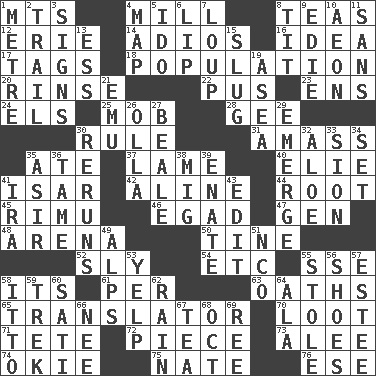 ACROSS 1. Mountains (abbr.) 4. Place where flour is made 8. Afternoon social gatherings 12. 4th largest of the Great Lakes 14. Goodbye (Sp.) 16. The content of cognition 17. Labels 18. Census information 20. Remove soap 22. Purulenc 23. Followers of ems 24. Raised railways 25. Crowd into 28. Turn to the right 30. Governing power 31. Collect or gather 35. Had dinner 37. Unable to walk 40. Writer Wiesel 41. Austrian river, tributary to the Danube 42. Place in a line 44. Carrot, for example 45. Tall New Zealand timber tree 46. Mild oath 47. Commissioned military rank (abbr.) 48. Sports stadium 50. Prong on a fork 52. Insidious 54. And so on (abbr.) 55. Compass dir. 58. ___ a Wonderful Life 61. For each 63. Curses 65. Interpreter 70. Plunder 71. Wig 72. Component 73. Toward shelter 74. Migrant worker of the '30s 75. Nathan's nickname 76. Compass dir. DOWN 1. Distance measurement (Brit.) 2. Lag or linger behind 3. Omens 4. Atlas unit 5. Wedding promise 6. Mouth edge 7. Central Nebraska county 8. Teat (slang) 9. Singer Brickell 10. Age 11. Without 13. Curvy letter 15. A hard, heavy blow 19. At sea 21. Australian flightless bird 26. Spanish pot 27. Memphis, Tenn. Street 29. Develop 30. Summer TV shows 32. _ vera 33. The Jewish people; Israel 34. Put into a specified state 35. SW Saudi Arabia district 36. Not wild 38. Russian fighter aircraft 39. Related on the mother's side 41. Retirement account (abbr.) 43. Prepare for publication 49. High mountains 51. Non-commissioned officer (abbr.) 53. Sharp bark 55. Took without asking 56. Imelda's hoard 57. First name in cosmetics 58. "Tell ____ the Marines!" 59. Long journey 60. Suttee (variant) 62. Water falling in drops from the sky 64. According to 66. Born 67. Beverage made from leaves 68. Sep. follower 69. To sift