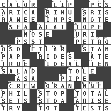 ACROSS 1. Bodily heat indicating an inflammation 6. Mouth edge 9. Personal Computers (abbr.) 12. N. Chile seaport 13. Tall New Zealand timber tree 14. Indian titles of respect 15. Indian princess (variant) 16. Naughty children 17. Observe 18. Ocean 19. Jai _ 20. Drink excessively 21. Sense of smell 23. RI univ. 24. Inconspicuous attention getter 25. Stone: prefix 28. Bear (Spanish) 30. Having threads 34. Thailand, formerly 35. Infant food 36. Amusement-park features 38. Had dinner 39. Loyal 41. Standard of perfection 43. Nine, plus one 44. First course 46. Lacquered or enameled metalware 48. White ___ sheet 49. Corncob 50. Ship's personnel 51. NW Algerian seaport 53. Compass dir. 56. Silvers or Donahue 57. Halt 58. "_____ Recall" 60. Arranges properly for use 61. Portico 62. Ascend 63. Attempt 64. Small child 65. Trials DOWN 1. Auto 2. Ancient river in northeast Turkey 3. Actor's bit 4. Seas 5. Actress Charlotte 6. Pale green bean 7. Body of Kaffir warriors 8. Festering 9. Conciliate 10. Quote 11. Compass dir. 13. Cause heat under the collar 14. Sounds asleep 19. Having gotten out of bed 20. Uncastrated adult male sheep 22. Order of Saint Francis (abbr.) 24. Teen's desire 26. Assign a rank or rating to 27. Sign of things to come 28. Elects 29. "Two Mules for Sister ____" 31. Cards in a Roman deck? 32. Find the sum of 33. Portuguese money of account (variant) 37. Smooth fabric 40. Artist's stands 42. Trim (branches) 45. Simpleton 47. Poe poem 49. Dad 50. "Mermaids" star 51. Von Bismarck 52. Carrot, for example 54. Nuclear Threat Initiatives 55. 90 degrees 56. Pacific Standard Time (abbr.) 57. Fast jet (abbr.) 58. Make lace 59. French article
