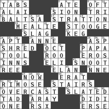 ACROSS 1. Bar bills 5. Had dinner 8. Often (poetically) 11. Jai _ 12. The Jewish people; Israel 13. Three (prefix) 14. Greek mezzo-soprano Agnes 17. Ski resort town in Vermont 19. Ear of corn 21. Moe Howard, for one 22. Volcanic refuse 23. Cask 24. Fitting 27. Queen of England 1702-14 29. Cleo's killer 32. Tear up 34. Sep. follower 36. Dad 37. Instrument 38. Friend of Pooh 39. Greek god of love 40. Restaurants 41. Biblical high priest 42. Snout, nose 43. To sift 44. Flair 46. Compass dir. 47. Immediately 50. Part of Q.E.F. 52. Full of chinks, cracks, or crevices 55. Flight of steps 57. Cloudy 59. Scheduled 62. Small amount or degree 63. Like ___ of sunshine 64. "You Light Up My Life" star Conn 65. Single 66. Acura sports coupe 67. Celtic language DOWN 1. Bar bill 2. According to 3. Lip ointment 4. Locates 5. Small island 6. Cod relative 7. Related on the mother's side 8. Von Bismarck 9. Toadlike animal 10. Prong on a fork 12. Compass dir. 15. Vegetable dish 16. ____ Jay Lerner 18. Coat; cloak 20. Dismiss 24. Moving about 25. Give a jingle 26. Heavy duty weighing machine 28. Learning spot: Fr. 29. Composer Copland 30. Soup utensil 31. Thick mixture 33. Raised railways 35. Bathroom 36. Writing instrument 42. Slow-paced one 45. Caspian sea tributary 47. Not either 48. Motion picture award 49. Puts on (as clothing) 51. Barter 52. Printing process, for short 53. _ the terrible 54. Ancient Persian 55. Filthy place 56. Use a swizzle stick 58. Saxophone 60. Begley and Asner 61. Pass on