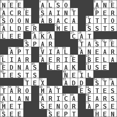 ACROSS 1. Born 4. In addition 8. A saturated hydrocarbon 11. 43,560 square feet 13. Inhabitant of Heaven 15. For each 16. Within a short period 17. Phillipine bananalike plant 18. "Tell ____ the Marines!" 19. Tree or shrub in the Birch family 21. Cartoonist voice _ Blanc 22. Fast planes 23. Area sheltered from the wind 24. Alias (abbr.) 27. Feline 29. Coast Guard woman 30. Clothes sense 34. Fitting 36. Small bottle 39. Approach 40. One who doesn't tell the truth 41. Nest on high 43. Actor Lugosi 44. Ferber et al. 46. Path through which fluid escapes 47. Purpose 48. Trials 49. Famous astronaut Armstrong 51. John Ritter's dad 53. Increase 54. R.R. building 57. Edible starchy tuberous root 60. Floor protector 63. _____ Park, CO 65. Actor Alda or Thicke 66. N. Chile seaport 69. Hearing organs 70. Was introduced to 71. Sir (Sp.) 72. Domed church section 73. Perceive with the eye 74. Back-to-school mo. 75. Layer DOWN 1. Relating to the nose 2. Learning spot: Fr. 3. Wear away 4. White ___ sheet 5. Experiment locale 6. Thailand, formerly 7. At one time in the past 8. Flats, for short 9. Remaining after all deductions 10. Greek god of love 12. Compass dir. 14. Baby powder 18. Byzantium, centuries later 20. Reproach for some lapse or misdeed 25. Polynesian shrub of the pepper family 26. Satellite of Uranus 28. "One Day ___ Time" 29. Ski resort town in Vermont 31. Perceives with the eye 32. Story 33. Epoch 34. Helper 35. Baking dishes 37. "We ___ not amused" (Victoria) 38. Climbing, woody, usually tropical vines 40. Allow 42. Supplemented with great effort 45. Compass dir. 50. Binary compound 52. Dec. holiday 54. Staphylococcus 55. Laconic 56. NE Netherlands city 57. Scottish caps 58. Toward shelter 59. Assign a rank or rating to 61. Ancient Greek god of war 62. Prong on a fork 64. Ocean 67. Police officer (slang) 68. Nonscientific branch of learning