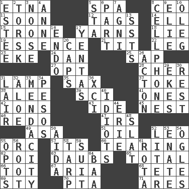 ACROSS 1. Inactive volcano in Sicily 5. Health resort 8. Corporate head (abbr.) 11. Within a short period 12. Labels 14. Pipe bend 15. Marketplace scale 17. Entertaining tales 18. Untruth 19. Core 21. Teat (slang) 22. Part of a journey 23. Make supply last 24. One of the 12 tribes of Israel 25. Plant excrement 27. Elect 28. "Mermaids" star 31. Desk light 35. Saxophone 37. Puff or smoke 38. Toward shelter 39. _-fi 41. Singles 42. Charged atoms 43. Binary compound 45. A home for chicks 46. Redecorate 47. Big collection agency 49. White ___ sheet 51. Petroleum 52. Lion 55. The grampus (Milton) 57. ___ a Wonderful Life 60. Lacerating 62. Luau course 63. Applies to a surface 65. "_____ Recall" 66. Small child 67. Operatic vocal solo 68. False hair 69. Filthy place 70. Parent Teacher Association (abbr.) 71. Ancient Greek god of war DOWN 1. First name in cosmetics 2. Cod relative 3. Trap for birds or small mammals 4. Queen of England 1702-14 5. R.R. building 6. Component 7. Hindu god of fire 8. Portable communications device 9. Writer Wiesel 10. Cassini of fashion 13. Fast planes 16. Inside; within (prefix) 17. Gossips 20. Balmoral and tarboosh 26. NE Massachussets city 29. Supplements with great effort 30. Repose 31. Den 32. Medicinal plant 33. Ananias' fault 34. Mexican monetary units 36. One more than ninety 40. Foolish or stupid persons 44. 4th largest of the Great Lakes 48. Narrow board 50. Opera by Verdi 52. 61 cubic inches 53. Related on the mother's side 54. Stares at amorously 55. Elects 56. Carrot, for example 58. Canvas cover 59. Set of matching outer garments 61. Roll call or roster of names 64. Sound made by sheep