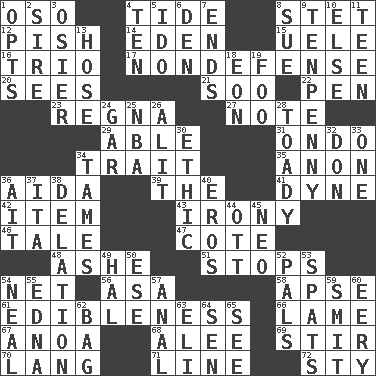 ACROSS 1. Bear (Spanish) 4. Periodic rise and fall of the sea level 8. Proofreading order 12. Expression of disdain 14. Locale of original sin 15. Ubangi River tributary 16. Musical group of three 17. Unrelated to defense, as in spending 20. Observes 21. "Barney Miller" actor Jack 22. Writing instrument 23. Rain (Swedish) 27. Observe 29. Competent 31. Southwest Nigerian state 34. Distinguishing feature 35. Soon (poet.) 36. Opera by Verdi 39. Definite Article 41. Centimeter-gram-second unit of force 42. Detail 43. Literary sarcasm 46. Lie 47. ____ d'Azur (French Riviera) 48. American tennis player Robert 51. Halts 54. Fish or hair follower 56. White ___ sheet 58. Domed church section 61. The property of being fit to eat 66. Unable to walk 67. Small Philippine buffalo 68. Toward shelter 69. Use a spoon 70. Austrian-born American filmmaker Fritz 71. Actor's bit 72. Filthy place DOWN 1. Chooses 2. The founder of a family 3. Flexible twig of a willow tree 4. "___ Little Indians" 5. Wedding promise 6. Lair 7. Extremities 8. Take to court 9. 3-inch nail 10. Otherwise 11. Adolescent 13. Stockings 18. Period of immesurable duration 19. Egg _ yung 24. Slender fish 25. Basketball assoc. 26. Set down 28. Sycophant 30. Value system 32. Spanish title 33. Single 34. Makes less strong or intense 36. Small island 37. Call ___ day 38. Conveyance 40. Greek god of love 44. Baseball player Mel 45. Modern: prefix 49. Actor Linden 50. Compass dir. 52. Friends 53. Arguments over trivial matters 54. Anneal 55. Pulitzer Prize-winning author Ferber 57. Of or related to the anus 59. Stricken, poetically 60. Suggestive of the supernatural 62. Paper or plastic container 63. Connecticut Ivy Leaguer 64. Elected rep. 65. Observe