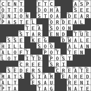 ACROSS 1. Penny 5. And so on (abbr.) 8. Cleo's killer 11. Von Bismarck 12. Capital of the state of Qatar 14. Observe 15. The state of being joined or united 17. Portico 18. Letter starter 19. Soft color 21. Severe or trying experience 23. Beverage made from leaves 25. Within a short period 26. Play the lead 27. Conclude 28. Third day of the wk. 31. Compass dir. 33. Barrel 35. A sleeping potion; an opiate (poet.) 37. Land elevation 38. "Barney Miller" actor Jack 40. ____ Jay Lerner 41. High up in or into the air 43. Cooking vessel 45. Nine, plus one 46. Car dealer's back yard 47. It would 50. Mail 52. Algonquian 53. _ Lanka 54. Spring feasts 56. Make 61. Floor coverings 62. Thailand, formerly 65. Having ears or earlike features 66. The first octave above the treble staff 67. He sold his birthright 68. Painter Guido (1575-1642) 69. Parent Teacher Assoc. 70. Label 71. Nathan's nickname DOWN 1. Clever action or accomplishment 2. Inactive volcano in Sicily 3. Nuclear Threat Initiatives 4. A blast of a horn 5. Begley and Asner 6. Small child 7. Elect 8. Toward the sea 9. Lick closed 10. For each 13. Composer Copland 16. Remaining after all deductions 18. Lair 20. Path through which fluid escapes 22. Texas town _ City 24. Ancient Greek god of war 26. Automatically 28. Falsehood 29. ____ Bator, Mongolia 30. Car or cant ending 31. Grain storage tower 32. Narrow opening 34. Grand Old Party 36. Electrical Unit 37. Actor Linden 39. I made a mistake 42. Become fatigued 44. Torque (variant) 48. Laconic 49. Stop 51. Title for a man of rank and authority 52. Music discs 54. Table seasoning 55. Singer James 57. Merit 58. Length times width 59. Portable shelter 60. Singer Brickell 61. Atlas unit 63. Auto club (abbr.) 64. Java container