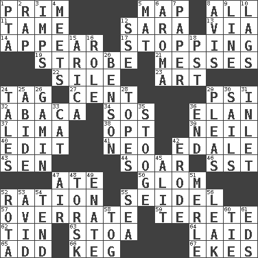 ACROSS 1. Demure 5. Atlas unit 8. Everything 11. Not wild 12. "Two Mules for Sister ____" 13. By way of 14. Become visible 17. Discontinuing 19. Disco prop 21. Makes clutter 22. Drop; flow; fall 23. Nonscientific branch of learning 24. Label 27. Penny 29. Air pressure measure (abbr.) 32. Phillipine bananalike plant 34. Mayday 36. Liveliness 37. Pale green bean 38. Elect 39. Famous astronaut Armstrong 40. Prepare for publication 41. Modern: prefix 42. Peak District village in England 43. Elected rep. 44. Fly high 46. Fast jet (abbr.) 47. Had dinner 50. Seize upon or latch onto something 52. Food allowance for one day 55. A glass for beer 57. Make much ado about nothing 59. Cylindrical with tapered ends 62. Metal container 63. Portico 64. Put down 65. Increase 66. Cask 67. Makes supply last DOWN 1. Parent Teacher Association (abbr.) 2. Strike 3. Naughty children 4. Confronts 5. Floor covering 6. Scent 7. Some stationery 8. Opinion 9. Actor's bit 10. Straggles 12. Compass dir. 15. N. Chile seaport 16. Hero or heavy, e.g. 18. Pacific Standard Time (abbr.) 20. Gillaume's butler role 24. Lies 25. Tolerate 26. Homeless child 28. Drinks excessively 29. Entreaties 30. Moves on water 31. An arm off of a larger body of water 33. Domesticated feline 35. Moe Howard, for one 36. Conclusion 42. Eat (away) 45. Set down 47. Wind 48. Cod relative 49. Related on the mother's side 51. Haggard of country music 52. Roll call or roster of names 53. Enthusiastic 54. Be inclined (to) 55. Ocean 56. Path through which fluid escapes 58. Coat; cloak 60. Make a knot 61. Begley and Asner