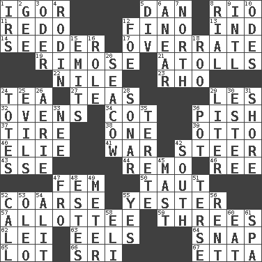 ACROSS 1. Russian composer Stravinsky 5. Daniel's nick name 8. River (Sp.) 11. Do over again 12. A pale, very dry sherry 13. Indiana (abbr.) 14. Sowing specialist 17. Make much ado about nothing 19. Full of chinks, cracks, or crevices 21. Ringlike coral islands and reefs 22. "Death on the ____" 23. 17th letter of the Greek alphabet 24. Afternoon social gathering 27. Afternoon social gatherings 29. French article 32. Baking chambers 34. Small bed 36. Expression of disdain 37. Become fatigued 38. Single 39. "Beetle Bailey" pooch 40. Writer Wiesel 41. Armed conflict 42. Guide 43. Compass dir. 44. San ____ (Riviera town) 46. Portuguese money of account (variant) 47. Opposite of masc. 50. Strained 52. Unrefined 55. Of or pertaining to yesterday 57. One to whom something is allotted 59. Threesomes 62. Luau accessory 63. Snakelike fish 64. Fastener 65. Car dealer's back yard 66. Indian title of respect (Mr.) 67. Singer James DOWN 1. Big collection agency 2. Turn to the right 3. Baltic tributary 4. "The Thinker" sculptor 5. HTML Container Element 6. Approach 7. _ pole 8. Monetary unit of Yemen 9. International (abbr.) 10. Lyric poems 12. Enemy 15. Sends forth 16. Hero or heavy, e.g. 18. Friend of Pooh 20. Manatee 24. Hauls 25. Vices 26. Nest on high 28. Echolocation 29. 61 cubic inches 30. First name in cosmetics 31. Dinah or Pauly 33. Born 35. Cylindrical with tapered ends 36. Cooking vessel 42. Compass direction 45. Vertical spar for supporting sails 47. Back 48. _____ Park, CO 49. Distance measurement 51. Laconic 52. Give a ring to 53. Margarine 54. Came down and settled, as after flight 55. Consenting reply 56. Monthly bill 58. Connecticut Ivy Leaguer 60. Ingest 61. Health resort