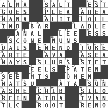 ACROSS 1. _ mater 5. Table seasoning 9. Eastern Standard Time (abbr.) 12. Travels 13. Entreaty 14. Length times width 15. Nanny 16. Set down 17. Hang loosely or laxly 18. Indiana (abbr.) 19. Drinking establishment 21. Dipping utensil 22. Of or related to the anus 24. Area sheltered from the wind 26. Curvy letter 27. Biscuitlike quick bread 28. Religious women 29. Raised platform 30. Make improvements or corrections to 32. Puff or smoke 36. Johnson of "Laugh-In" 37. Actress Gardner 38. At sea 39. Negative votes 40. Disparaging remarks 42. Proofreading order 43. Snakelike fish 44. Eucharist need 46. Perceive with the eye 49. Mountains (abbr.) 50. Presage 51. Taiwanese island in East China Sea 53. "One Day ___ Time" 54. Player for Phoenix 57. American tennis player Robert 58. Baby bed with high sides 61. Grain storage tower 62. It's straight from the horse's mouth 63. Opera by Verdi 64. _ the terrible 65. Affectionate concern, for short 66. Carrot, for example 67. Western Nevada city DOWN 1. Hindu god of fire 2. Grant temporary use of 3. Ananias' fault 4. White ___ sheet 5. Coast Guard woman 6. Everything 7. Luau accessory 8. Make lace 9. Wear away 10. Makes a sale 11. Stories 14. According to 19. Prohibit 20. Toward shelter 21. French article 23. Olfactory organs 24. Type of eclipse 25. Conclusion 27. "Two Mules for Sister ____" 28. Congenital growth or mark on the skin 29. Daniel's nick name 31. Shopping centers 32. Clothes sense 33. Clearly or manifestly demonstrative 34. Peachy ____! 35. Erode 40. Arrange properly for use 41. Blemish 43. Australian flightless bird 45. Housemaid (var.) 46. Don Adams' spy role 47. Artist's stand 48. Principle of right and wrong 52. Elected rep. 53. Blind as ____ 55. ____ Bator 56. Words to Nanette 58. 4-wheeled motor vehicle 59. River (Sp.) 60. Wedding promise 61. Title for a knight
