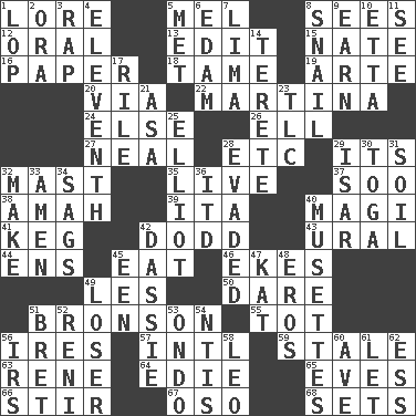 ACROSS 1. Old wives' tales, e.g. 5. Cartoonist voice _ Blanc 8. Perceives with the eye 12. Relating to the mouth 13. Prepare for publication 15. Nathan's nickname 16. Some stationery 18. Not wild 19. Johnson of "Laugh-In" 20. By way of 22. Chrissie's court nemesis 24. Otherwise 26. Pipe bend 27. Anneal 28. And so on (abbr.) 29. It is 32. Vertical spar for supporting sails 35. Not recorded 37. "Barney Miller" actor Jack 38. Wet nurse 39. Call ___ day 40. Wise men 41. Barrel 42. Texas town _ City 43. Mountain range 44. Followers of ems 45. Consume 46. Makes supply last 49. French article 50. Have the gumption 51. "Death Wish" actor 55. Small child 56. Angers 57. International (abbr.) 59. Having lost freshness 63. French philosopher Descartes 64. Singer Brickell 65. Nights before holidays 66. Tumult 67. Bear (Spanish) 68. Arranges properly for use DOWN 1. Trim (branches) 2. Mouth or opening 3. Strike 4. Veterans Day date 5. Was introduced to 6. Dutch treat 7. Pale green bean 8. Slow-paced one 9. Merit 10. Singer James 11. Observe 14. Cigar-shaped 17. Cause heat under the collar 21. White ___ sheet 23. Affectionate concern, for short 25. American author Paul (1891-1958) 28. Dodged 29. Austrian river, tributary to the Danube 30. Ancient Roman robe 31. Earth 32. Cause to be 33. So be it 34. Sinks 36. It would 40. French bagpipes 42. Hyrax 45. Car or cant ending 47. Krazy ___ of comics 48. Greek god of love 49. Failure 51. Cy Young winner Saberhagen 52. Painter Guido (1575-1642) 53. Southwest Nigerian state 54. Nuclear Threat Initiatives 56. Big collection agency 58. Lion 60. "___ Maria" 61. Allow 62. Curvy letter