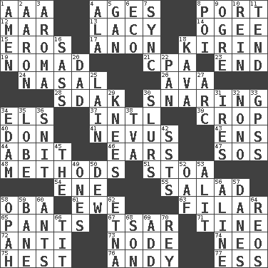 ACROSS 1. Auto club (abbr.) 4. Eons 8. Left side of a ship or aircraft 12. Make imperfect 13. Made of lace 14. Double curve, resembling the letter S 15. Greek god of love 17. Soon (poet.) 18. Japanese brewing company 19. Roamer 21. Tax preparer (abbr.) 23. Conclude 24. Rhinal 26. Actress Gardner 28. Neighbor of Neb. 30. Catching in a trap 34. Raised railways 37. International (abbr.) 39. Riding implement 40. Spanish title 41. Congenital growth or mark on the skin 43. Followers of ems 44. "This won't hurt ____!" 46. Hearing organs 47. Distress signal 48. Modes 51. Portico 54. Compass dir. 55. Vegetable dish 58. Chief or king in Benin or Nigeria 61. She-sheep 63. Of or pertaining to a thread or threads 65. Leg coverings 67. Russian ruler of old 71. Prong on a fork 72. Opposed to 73. Thickened enlargement 74. Modern: prefix 75. Behest 76. "60 Minutes" Commentator Rooney 77. Curvy letter DOWN 1. So be it 2. Composer Copland 3. Odor 4. Insect wing 5. Separate the seeds from cotton 6. Environmental prefix 7. Synchronize (abbr.) 8. Luau course 9. Legendary monster 10. It's straight from the horse's mouth 11. Watch over 16. Backtalk 18. Polynesian shrub of the pepper family 20. Male parent 22. Baking dish 25. (Had) reclined 27. Curve 29. Leg joints 30. Plays smoothly or legato 31. Angers 32. Words to Nanette 33. Global Positioning Systems (abbr.) 34. Dutch treat 35. Ear part 36. In a ____ (agitated or irritated) 38. Federal power corp. 42. Fast planes 45. Definite Article 49. Washington bills 50. Morning condensation 52. Clumsy lout 53. Set down 56. Place in a line 57. Natives or inhabitants of Denmark 58. Brightly colored fish 59. Object of repulsion 60. Pismires 62. Inactive volcano in Sicily 64. Vintage cars 66. Teat (slang) 68. Boy, to dad 69. Find the sum of 70. Marina Del _, California
