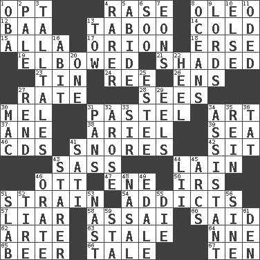 ACROSS 1. Choose 4. Raze (variant) 8. Margarine 12. Sound made by sheep 13. Off limits 14. Chilled 15. Silent film actress Nazimova 17. Constellation of myth 18. Celtic language 19. Turned at an angle; bent 21. Cast a shadow over 23. Shallow baking pan 24. To riddle 26. Followers of ems 27. Pace 28. Perceives with the eye 30. Cartoonist voice _ Blanc 31. Soft color 34. Nonscientific branch of learning 37. One (Scot) 38. Satellite of Uranus 39. Ocean 40. Music discs 41. Sounds asleep 42. Be seated 43. Backtalk 44. (Had) reclined 46. Baseball player Mel 47. Compass dir. 50. Big collection agency 51. Put through a sieve 54. Inveterate users 57. One who doesn't tell the truth 58. Slender Brazilian palm 60. Stated 62. Johnson of "Laugh-In" 63. Lacking originality or spontaneity 64. Compass dir. 65. Fermented drink made from hops 66. Story 67. "___ Little Indians" DOWN 1. Chief or king in Benin or Nigeria 2. Diluted with white 3. Baron Munchausen's specialties 4. More uncommon 5. Stay 6. "Barney Miller" actor Jack 7. Immeasurably long periods of time 8. Seas 9. Titled peers of a realm 10. Otherwise 11. Wrote a lyric poem 13. Pull behind 16. "This won't hurt ____!" 20. Single 22. Person who is morally reprehensible 25. First name in cosmetics 27. Tear apart 29. Snakelike fish 30. Apple computer (short form) 31. Baking dishes 32. Came up 33. Title for a knight 34. Helper 35. It's straight from the horse's mouth 36. Make lace 41. Suttee (variant) 43. A viewer who gazes fixedly 44. Cards in a Roman deck? 45. Arches 46. Speak pompously 48. Rhinal 49. Peak District village in England 51. Thick slice 52. Hoop that covers a wheel 53. Political cartoonist Thomas 55. Expire 56. Trig term 59. R.R. building 61. Lair