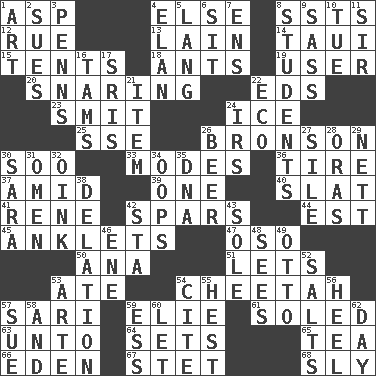 ACROSS 1. Viper 4. Otherwise 8. Fast planes 12. Regret 13. (Had) reclined 14. "Change" in Tahitian 15. Portable shelters 18. Pismires 19. One who makes use of a thing 20. Catching in a trap 22. Begley and Asner 23. Stricken, poetically 24. Frozen water 25. Compass dir. 26. "Death Wish" actor 30. "Barney Miller" actor Jack 33. Methods 36. Become fatigued 37. Among 39. Single 40. Narrow board 41. French philosopher Descartes 42. Practice fights 44. Eastern Standard Time (abbr.) 45. Short socks 47. Bear (Spanish) 50. Santa ___, CA 51. Allows 53. Had dinner 54. Leopard's kin 57. Indian skirt 59. Writer Wiesel 61. Having a sole or soles 63. To (old English) 64. Puts into a specified state 65. Beverage made from leaves 66. Genesis locale 67. Proofreading order 68. Roguish DOWN 1. Nonscientific branch of learning 2. Takes to court 3. Actor Sean's family 4. Style 5. Austrian-born American filmmaker Fritz 6. Be seated 7. Followers of ems 8. SAT takers 9. Backtalk 10. Third day of the wk. 11. Title for a knight 16. Scottish caps 17. Indian titles of respect 21. A whole individual unit 22. Environmental prefix 24. Big collection agency 26. Fermented drink made from hops 27. Drop; flow; fall 28. Mouths or openings 29. Remaining after all deductions 30. "Two Mules for Sister ____" 31. Sign of things to come 32. Pig sound 34. I made a mistake 35. Heredity factor (abbr.) 38. Conveyance 42. R.R. building 43. Flatfish 46. Compass dir. 48. Perceives with the eye 49. Von Bismarck 52. Table seasonings 53. Johnson of "Laugh-In" 54. Quote 55. Command 56. Person who is morally reprehensible 57. Take to court 58. Also 59. Curvy letter 60. Allow 62. 24 hours