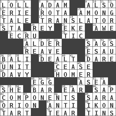 ACROSS 1. Hang loosely or laxly 5. First man 9. In addition 13. One of the Great Lakes 14. Round or rotation of duties 15. Amid 16. Lie 17. Interpreter 19. R.R. building 20. Marina Del _, California 21. Make supply last 22. Deep reverence 23. Shade of tan 25. Nervous spasm 26. Tree or shrub in the Birch family 30. Sinks 34. Rob, plunder, or pillage 35. He sold his birthright 36. Indonesian resort city 39. Started a card game 42. Have the gumption 43. A single undivided whole 44. Stop 46. _ Jones' Locker 47. Simpsons dad 48. Ovum 51. At sea 54. A female animal or person 57. Drinking establishment 58. Hearing organ 60. Plant excrement 62. Parts 65. "Two Mules for Sister ____" 66. Constellation of myth 67. Opposed to 68. Picture 69. Small pie 70. Pull apart 71. Airtight sealed metal containers DOWN 1. Allows 2. Speak pompously 3. Pale purple color 4. Area sheltered from the wind 5. Johnson of "Laugh-In" 6. Small, narrow, flatbottom fishing boat 7. "One Day ___ Time" 8. French painter Edouard 9. Wet nurse (var.) 10. Globular water bottle used in Asia 11. Overwhelm 12. Legendary monster 15. Actor Baldwin 18. What Jean-Claude Killy likes to do 20. General guideline 24. Noteworthy scarcity 27. Male parent 28. Night before a holiday 29. Arrive at 30. Spring feasts 31. White ___ sheet 32. Slender fish 33. Institute legal proceedings 36. Partially opened flower 37. Santa ___, CA 38. 54 in ancient Rome 40. Lion 41. Scottish cap 45. Shrivel 48. Inky black, to poets 49. Separate the seeds from cotton 50. Relatively large 52. 1973 Nobel Price Winner (Physics) Leo 53. Composer Copland 54. Highlander 55. Israeli folk dance 56. Independent ruler or chieftain 58. Singer James 59. SW Saudi Arabia district 61. Baking dishes 63. Plant holder 64. Compass dir. 65. Be seated