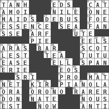 ACROSS 1. Hyperbolic tangent 5. Begley and Asner 8. Domesticated feline 11. Mine, in Marseilles 12. The longest river in the world 14. Single 15. Unmarried girls 17. To get out of a bus 18. Enemy 19. Center 21. Ocean 22. Air blower 23. Compass dir. 24. Sandy's bark 25. Shoshoni 27. Sliced dessert 28. Snakelike fish 31. Caspian sea tributary 35. Tavern 37. Native of Scotland 38. For fear that 39. Afternoon social gathering 41. Ballerina skirt 42. Comfort 43. Pipe bend 45. Connect, as a bridge 46. One of the Great Lakes 47. Greek goddess of the dawn 49. Indian title of respect (Mr.) 51. Adept person 52. Floor protector 55. Fish or hair follower 57. Apertif with cassis 60. Player piano 62. Mouth or opening 63. U. of Maine site 65. More valued for its uncommonness 66. Spanish title 67. Nathan's nickname 68. Common sense 69. Eastern Standard Time (abbr.) 70. Immediately 71. Against DOWN 1. Corrects by punishment or discipline 2. Collect or gather 3. Annoying sound 4. Flintstone garb 5. Compass dir. 6. Claim 7. Change direction abruptly 8. Java holder (2 wds.) 9. Small Philippine buffalo 10. Adolescent 13. He sold his birthright 16. Fastener 17. Outscore 20. Baby bed with high sides 26. Trials 29. Globular water bottle used in Asia 30. Make senseless or dizzy 31. Toward shelter 32. Buttocks 33. Helper 34. Bull 36. To separate or throw off 40. City in Syria 44. Australian parrot (variant) 48. Fly high 50. Visual representation of an object 52. Person of subnormal intelligence 53. Native American of Southwest Alaska 54. Tarsus (plural) 55. Connecting point 56. Greek god of love 58. SW Asia republic 59. Printing process, for short 61. Grandmother 64. ___ Haven, CT