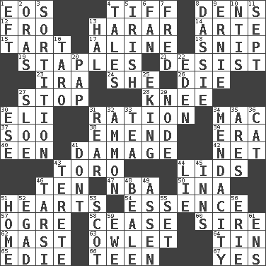 ACROSS 1. Greek goddess of the dawn 4. Small quarrel 8. Hiding places for outlaws 12. From 13. Ethiopian city, capital of Harari 14. Johnson of "Laugh-In" 15. Small pie 17. Place in a line 18. Sever or remove by pinching or nipping 19. Paper fasteners 21. Cease 23. Lyricist Gershwin 24. A female animal or person 26. Pass on 27. Constrict 28. Leg joint 30. Biblical high priest 31. Food allowance for one day 34. Apple computer (short form) 37. "Barney Miller" actor Jack 38. Make improvements or corrections to 39. Epoch 40. Car or cant ending 41. Break 42. Fish or hair follower 43. "Corrida" creature 44. Hats (slang) 46. Nine, plus one 47. Basketball assoc. 50. _ tizzy (2 wds.) 51. Centers of feelings and intuitions 54. Core 57. Legendary monster 58. Desist 60. Title for a man of rank and authority 62. Vertical spar for supporting sails 63. A small or young owl 64. Shallow baking pan 65. Singer Brickell 66. Adolescent 67. Consenting reply DOWN 1. Bank Draft (abbr.) 2. Mouths or openings 3. Making a chance decision by using lots 4. Stories 5. From or relating to Ireland 6. Air blower 7. Flintstone 8. Hyrax 9. Bert's buddy 10. Nuclear Threat Initiatives 11. Back-to-school mo. 13. Actor Linden 16. Pacific island yam 20. Infant food 22. Genesis locale 25. Supplementing with great effort 27. A type of plum 29. Thickened enlargement 30. Compass dir. 31. Stern 32. ID or VA city 33. Beverage made from leaves 34. Ananias' fault 35. Ancient Greek god of war 36. Domesticated feline 41. Do not 43. Cigar-shaped 44. Falsehood 45. Restaurants 46. Tarsus (plural) 48. Calif. Air Force Base 49. NE Netherlands city 51. Residence 52. Mild oath 53. Native of Scotland 55. Put into a specified state 56. One of the Great Lakes 59. She-sheep 61. Followers of ems