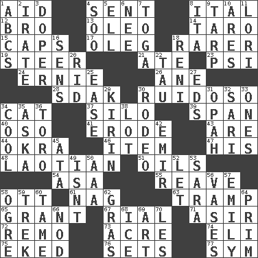 ACROSS 1. Assist 4. Transmitted 8. Slanted text style (abbr.) 12. Sis' sibling 13. Butter sub 14. Pacific island yam 15. Smile enhancers 17. Cassini of fashion 18. More valued for its uncommonness 19. Navigate 21. Had dinner 23. Air pressure measure (abbr.) 24. Bert's buddy 26. A saturated hydrocarbon 28. Neighbor of Neb. 30. Boisterous (Brazilian Portuguese) 34. Domesticated feline 37. Grain storage tower 39. Connect, as a bridge 40. Bear (Spanish) 41. Eat (away) 43. "We ___ not amused" (Victoria) 44. Gumbo ingredient 46. A distinct part 47. Part of HMS, perhaps 48. Of or relating to Laos or its people 51. Lubricates 54. White ___ sheet 55. Break or tear apart 58. Baseball player Mel 61. Tired old horse 63. _____ steamer (cargo ship) 65. Monetary aid 67. Monetary unit of Yemen 71. SW Saudi Arabia district 72. San ____ (Riviera town) 73. 43,560 square feet 74. Connecticut Ivy Leaguer 75. Supplemented with great effort 76. Puts into a specified state 77. Symbol (abbr.) DOWN 1. Lettered men learn these first 2. Feeling or showing extreme anger 3. Drug addict 4. "Barney Miller" actor Jack 5. Pipe bend 6. Born 7. Ancient Roman robe 8. Call ___ day 9. Canvas cover 10. Ancient Greek god of war 11. Australian parrot (variant) 16. Elected reps. 18. Painter Guido (1575-1642) 20. To free from 22. The 19th letter of the Greek alphabet 25. Comfort 27. Begley and Asner 29. Japanese brewing company 30. Cowboy competition 31. Brightly colored fish 32. Indian skirt 33. Singles 34. Calm and collected 35. "____ silly question..." 36. "Corrida" creature 38. Car dealer's back yard 42. Arab leader 45. "One Day ___ Time" 49. Is not 50. American Automobile Association (abbr.) 52. Allow 53. "Two Mules for Sister ____" 56. Flower holders 57. Poet Dickinson 58. Legendary monster 59. Long journey 60. Not wild 62. Pate de foie ____ 64. Demure 66. Allow head to fall sleepily 68. Frozen water 69. Nonscientific branch of learning 70. French article